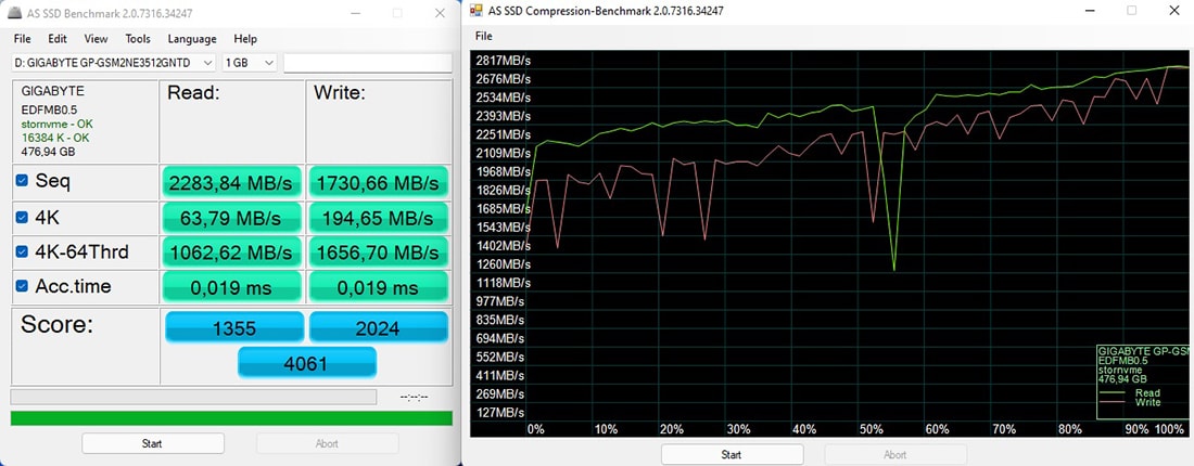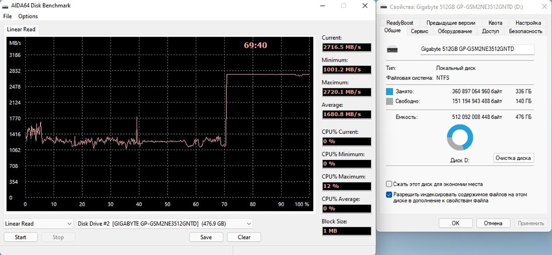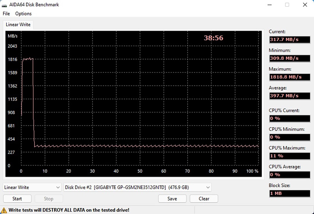 Gigabyte NVMe 512GB GP-GSM2NE3512GNTD — менее 5% объема в качестве SLC и максимальная скорость линейной записи около 1800 МБ/c на данном отрезке. Далее снижение записи до уровня хорошего SATA-накопителя, и весь оставшийся объем неизменно пишется на скорости около 317 МБ/c.