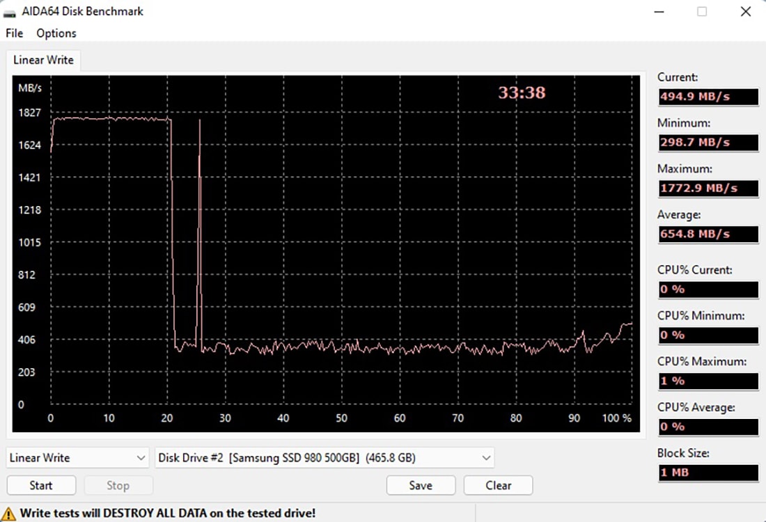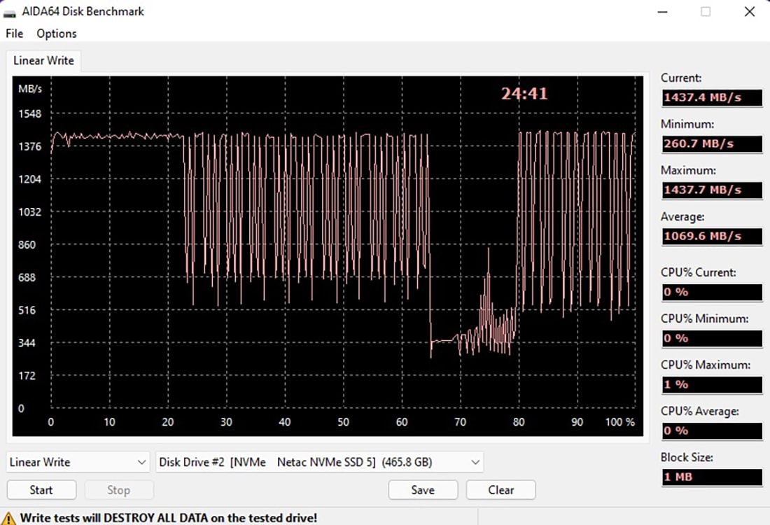 Netac N950E PRO 500GB — около 23% своего объема, или немногим более 100 ГБ, диск пишет на скорости 1400 МБ/с. Диапазон от 23 до 65% объема запись проходит в постоянном падении скорости до 700 МБ/с и обратном восстановлении до максимальных значений. На отметке приблизительно в 65% случается резкое снижение до скорости 260 МБ/с, и диапазон 65—80% объема накопитель пишет со средней скоростью 350 МБ/c, после начинает постепенно восстанавливать запись до 550—1400 МБ/с на последних 20% объема.