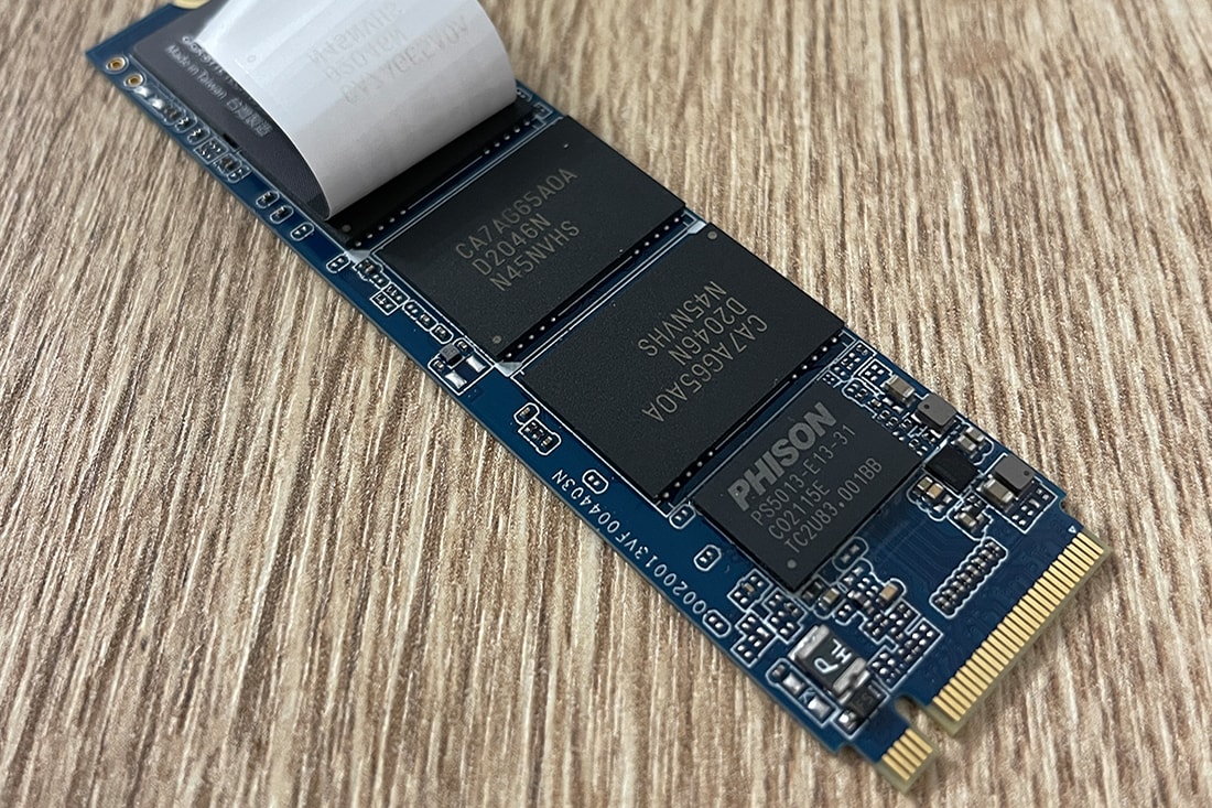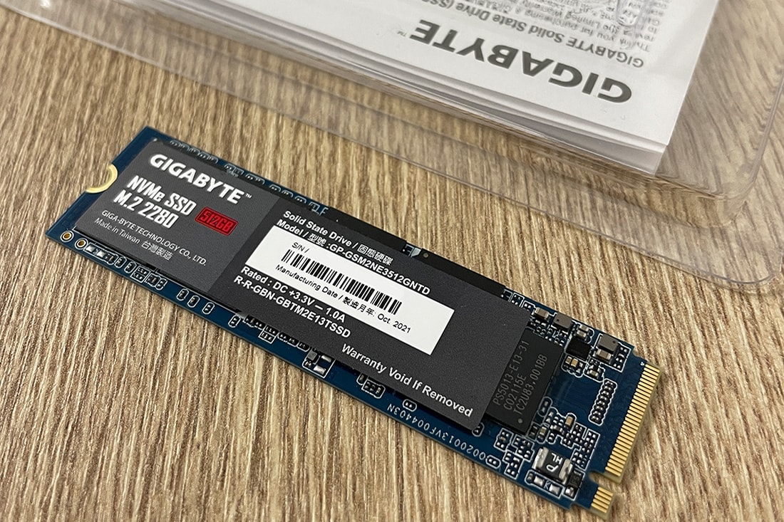 Накопитель от Gigabyte также поставляется в полноценной упаковке. У диска есть некоторая странность: он не имеет собственного названия, только маркировку. Внутри упаковки пластиковый блистер надежно защищает диск. Присутствует брошюрка. Никаких дополнений производитель не положил. Стикер полностью накрывает микросхемы NAND и частично контроллер. Аккуратно отгибаем и видим, что охлаждающих свойств стикер точно не имеет — обычная наклейка. Под ней четырехканальный контроллер Phison PS5013-E13-31 и четыре чипа TLC NAND производства YMTC. Собственный DRAM отсутствует, но есть поддержка технологии HMB (Host Memory Buffer): диск обращается к оперативной памяти ПК, используя ее как DRAM-буфер, и хранит там таблицу трансляции адресов, что должно положительно сказаться на производительности.