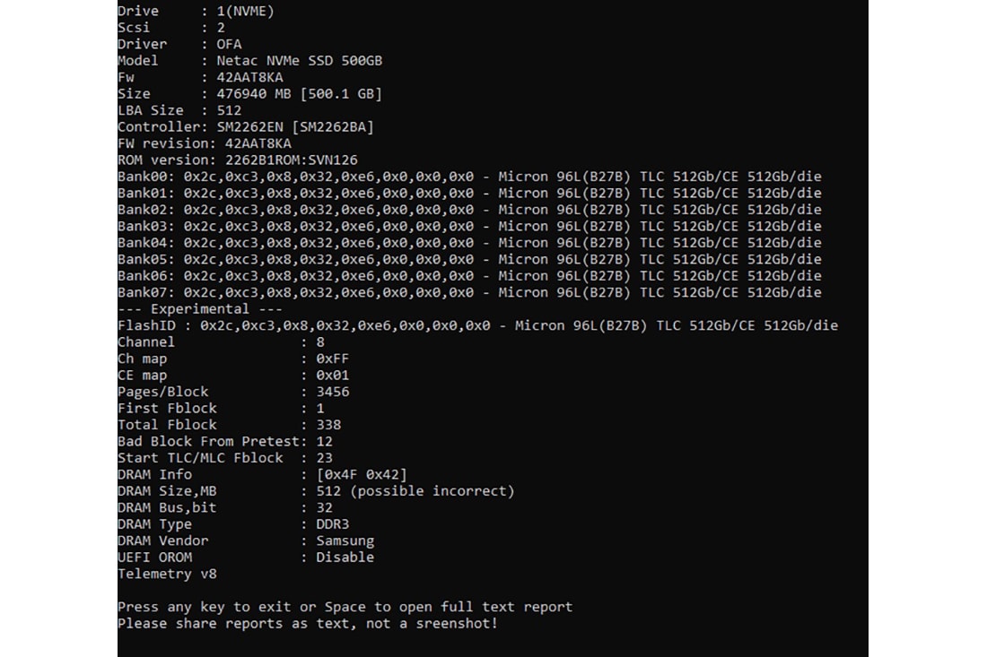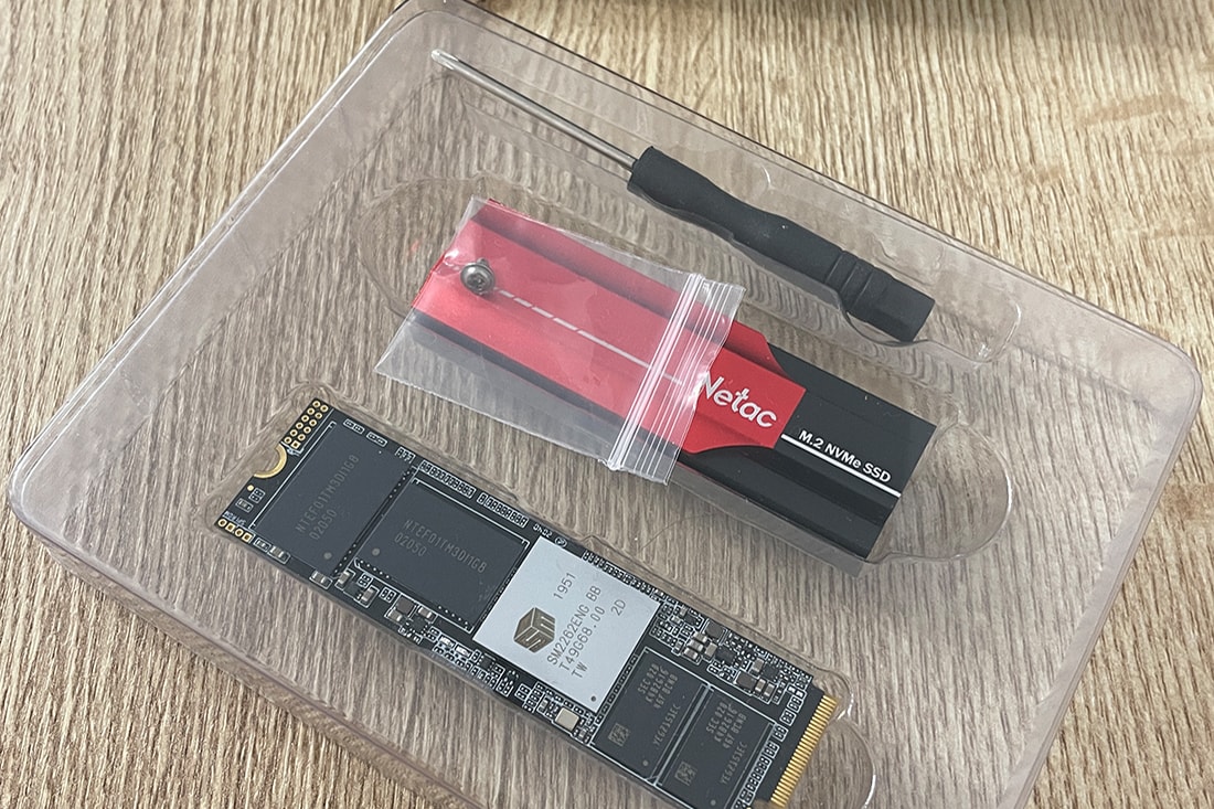 Следующим участником становится накопитель от китайского производителя Netac. Покупателя встречает красочная картонная упаковка. Внутри пластиковый блистер непосредственно с диском и щедрыми допами: отверткой, винтиком для фиксации (очень актуально, если вы успели потерять комплектные к материнской плате) и радиатором для охлаждения SSD с термопрокладкой. Весьма богатая комплектация, которая у других вендоров теперь практически не встречается. Компоновка чипов двусторонняя, что осложняет охлаждение. С лицевой стороны наклейка отсутствует, и можно свободно рассмотреть восьмиканальный контроллер Silicon Motion SM2262ENG, два чипа K4B2G1646F-BCNB DDR3 SDRAM производства Samsung и две микросхемы NAND. С обратной стороны диска обнаруживаются еще две микросхемы NAND и собственно стикер производителя. При помощи утилиты VLO уточняем параметры NAND — используется 96-слойная TLC производства Micron.