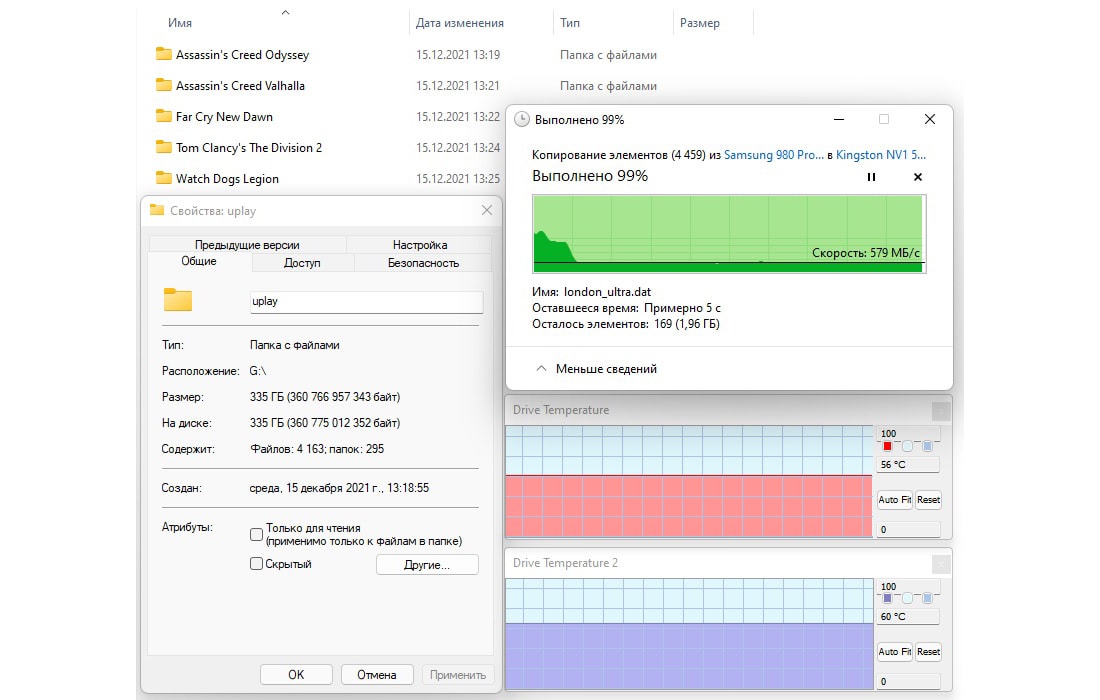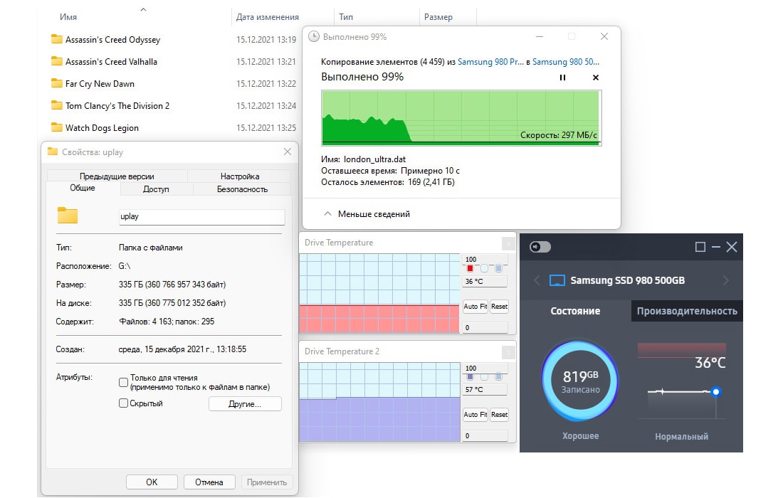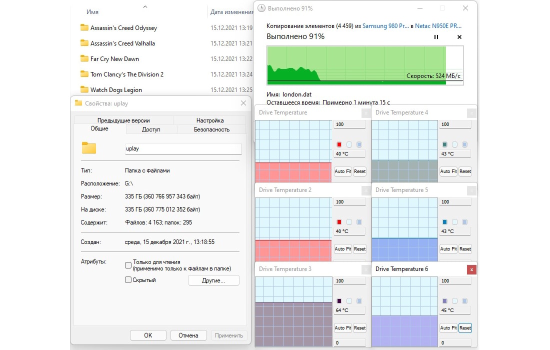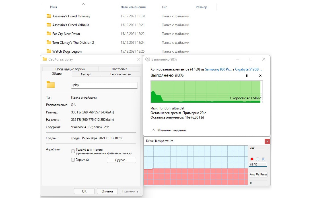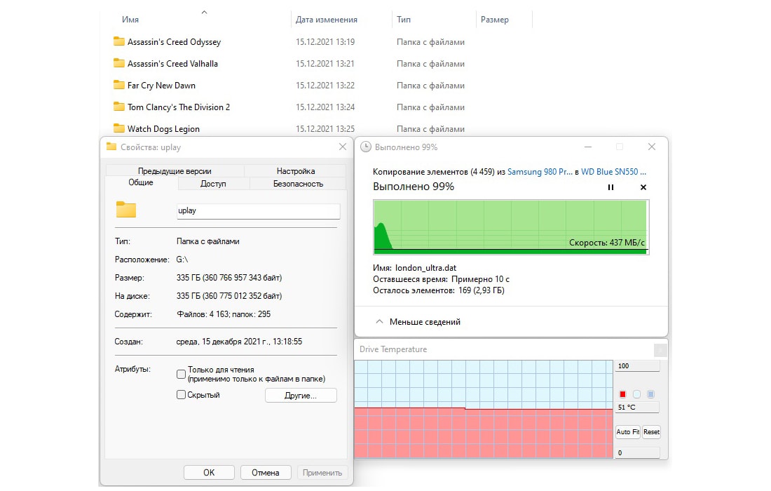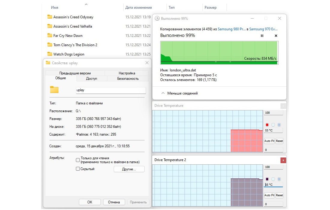 В качестве реальной нагрузки на диск использовалась папка игр библиотеки Uplay емкостью 335 ГБ, размещаемая на Samsung 980 Pro 500GB. Вполне реальная ситуация: вы купили диск и хотите перекинуть на него свою библиотеку игр. Как и в случае с линейной записью в AIDA64, накопитель Samsung 970 Evo Plus 500GB MZ-V7S500BW впечатляюще быстрее всех оппонентов. Аутсайдером при тестировании в таком типе нагрузки снова становится Samsung 980 500GB MZ-V8V500BW, который умудряется уступить даже SATA-накопителю. Самый высокий нагрев демонстрируют Netac N950E PRO 500GB и Samsung 970 Evo Plus 500GB MZ-V7S500BW, но их 64—65 градусов вписываются в норму, и для охлаждения более чем достаточно штатного радиатора материнской платы. Но в случае отсутствия в комплектации материнской платы радиатора для накопителя Samsung будет не лишним отдельно докупить радиатор, а вот Netac заботливо укомплектовал свой диск собственным охлаждением.