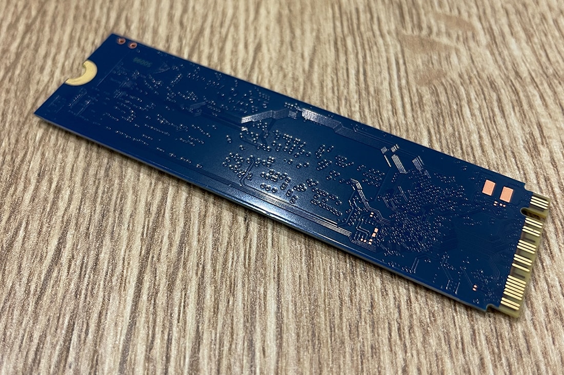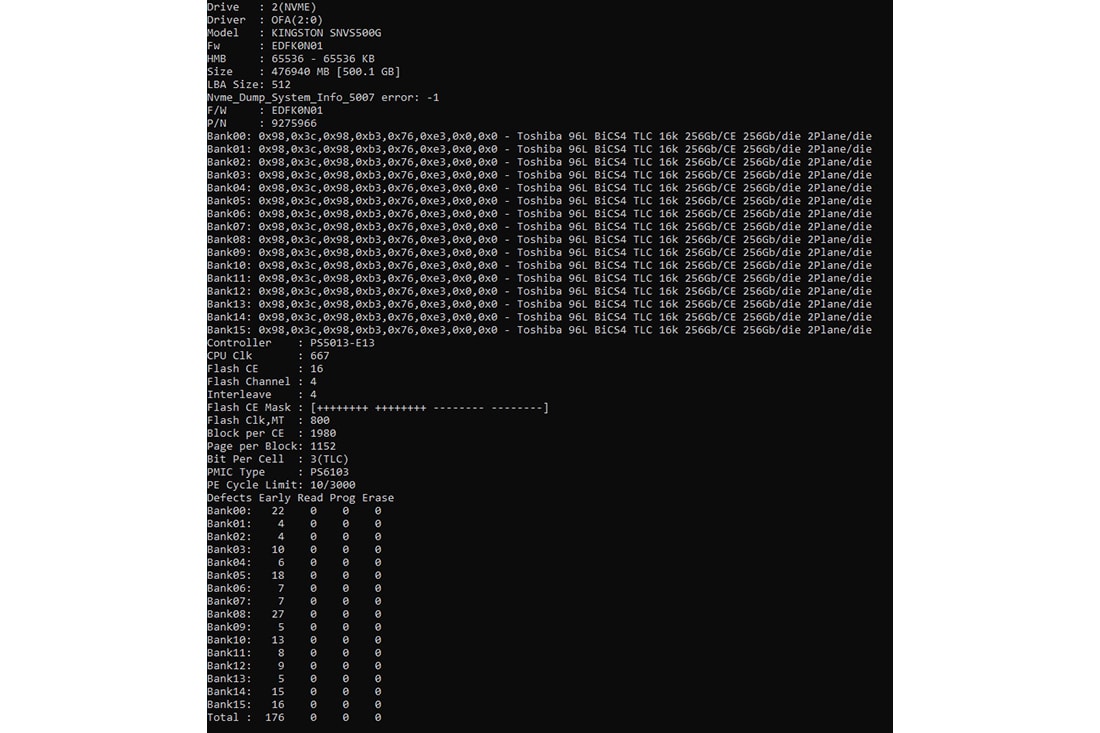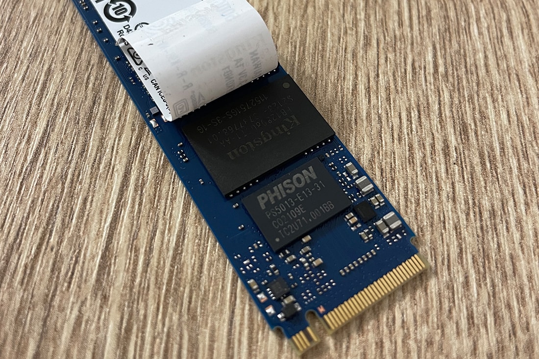 Бюджетник от Kingston с ходу демонстрирует свой класс: самая простая упаковка, более подходящая для USB-флешек. Ничего, кроме накопителя, в таком варианте и не разместить. Монтаж чипов односторонний: с обратной стороны абсолютная пустота. С лицевой — обычный стикер-наклейка с информацией. Аккуратно отгибаем и обнаруживаем уже знакомый четырехканальный Phison PS5013-E13-31 — такой же, как у Gigabyte. Четыре микросхемы флеш-памяти имеют собственную маркировку Kingston, однако утилита VLO определяет их как 96-слойную TLC производства Toshiba. Отсутствие DRAM-буфера компенсируется поддержкой технологии HMB.