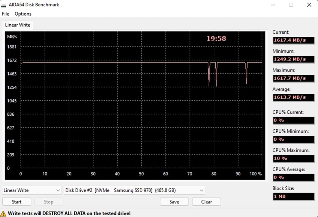Samsung 970 Evo Plus 500GB MZ-V7S500BW — феноменальный результат для данного теста. Весь объем диск записывает практически ровной линией по графику со скоростью чуть выше 1600 МБ/с. Изредка случаются падения скорости до минимальных 1250 МБ/с, такие показатели останутся недоступны всем остальным участникам.