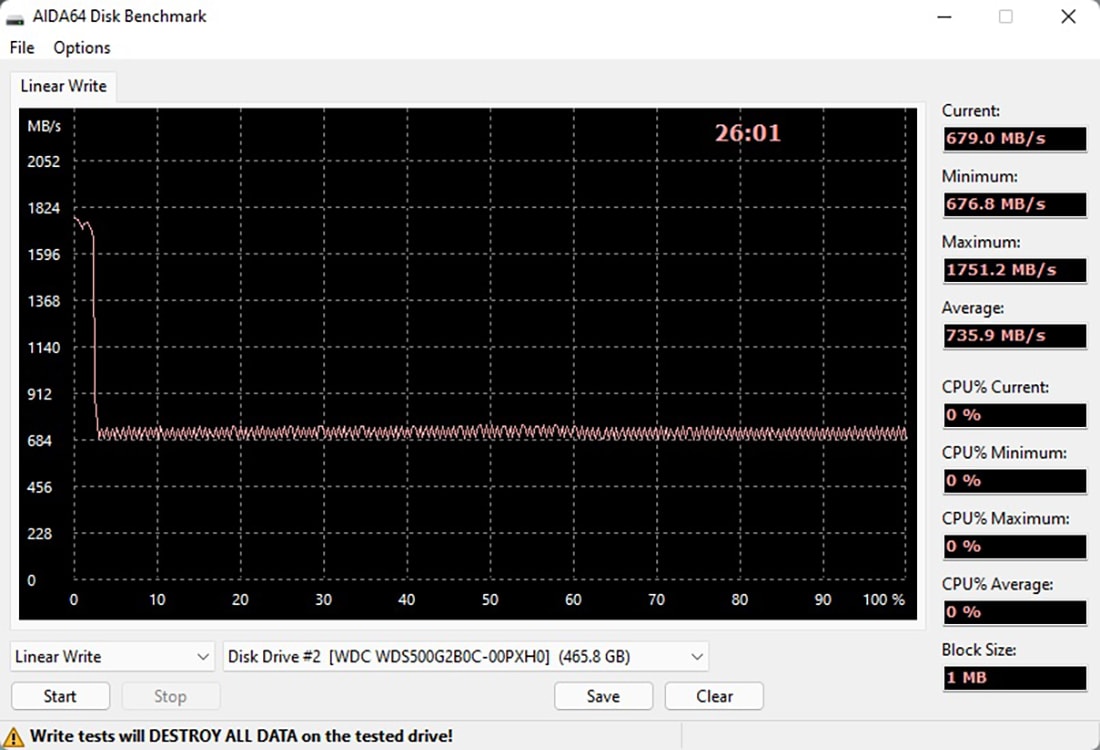 WD Blue SN550 NVMe 500GB WDS500G2B0C — минимальный размер SLC-кеша и резкое падение скорости от 1700 МБ/c к среднему значению около 700 МБ/c уже после 4% объема, на которых диск и пишет все оставшееся свободное пространство.