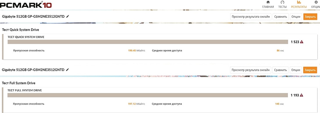 В более тяжелом тесте в роли единоличного лидера выступает Samsung 980 500GB MZ-V8V500BW, набирая практически такой же балл, как и в тесте Quick System Drive. Накопитель от Netac все еще хорош и уверенно держит второй результат. Диски от Gigabyte и Kingston показывают производительность на уровне Samsung 870 Evo.