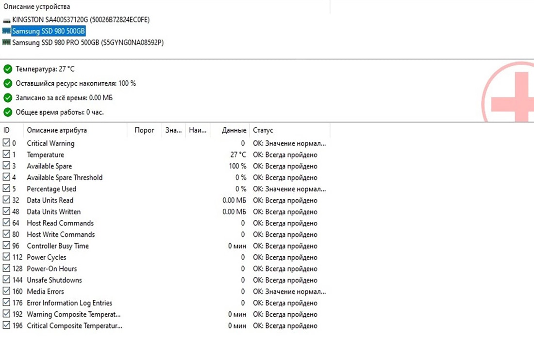 Считать атрибуты SMART можно посредством разнообразных утилит. Как правило, разрабатываемое ПО от производителей дисков великолепно справляется с этой задачей, но перегруженный графический интерфейс усложняет восприятие. Каждый пользователь сам выбирает удобный и привычный ему способ, хотя большинство попросту не заглядывают в этот раздел. Мы использовали для считывания атрибутов раздел «Хранение данных» утилиты AIDA64 Engineer, но кому-то может показаться более наглядным GUI утилиты CrystalDiskInfo. Заострять внимание на атрибутах не станем, отметим лишь, что все диски до начала тестирования были новые и они не имеют проблем по части SMART. А чтобы научиться понимать атрибуты, рядовому пользователю достаточно ознакомиться со статьей в «Википедии» по ссылке.