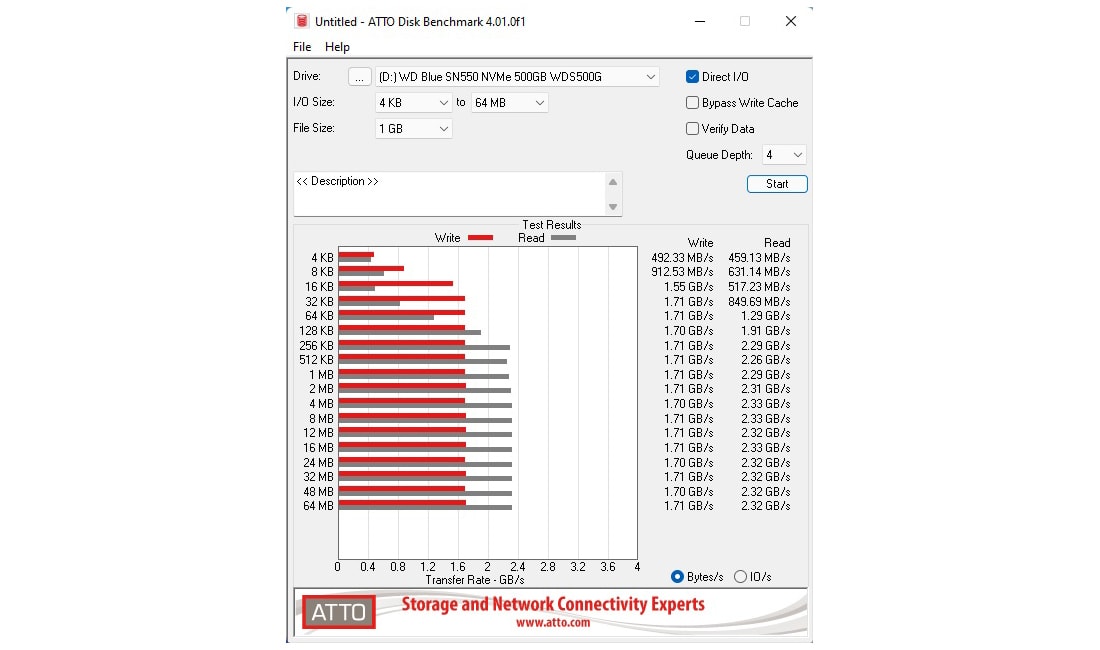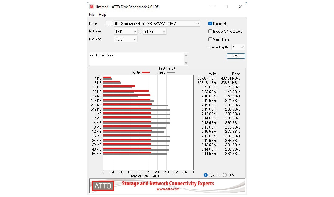 В следующей утилите сфокусируемся уже на работе с блоками размером по 8 KB. Здесь в лидерах снова диск от Samsung, но в этот раз модель 970 Evo Plus 500GB MZ-V7S500BW, компанию ему составил Netac N950E PRO 500GB. Худшие результаты продемонстрировал WD SN550, тем не менее почти в два раза превзойдя лучший потребительский SATA-диск. Остальные три участника показывают схожие результаты, немного недобрав до 900МБ/с.