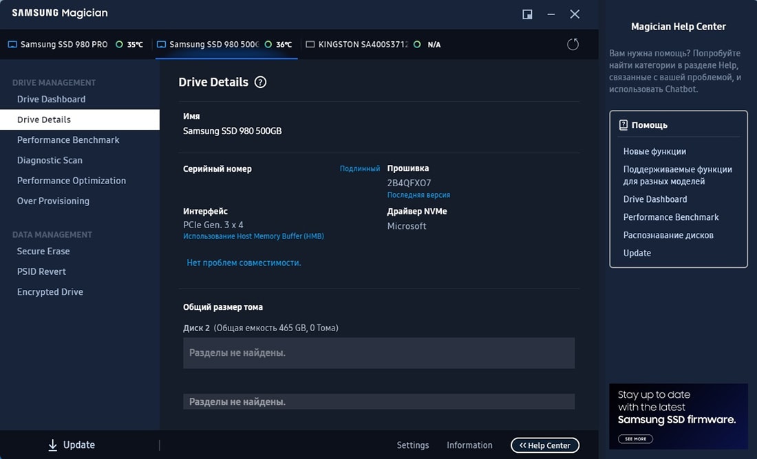 | Samsung 980 500GB MZ-V8V500BW | 465 ГБ | Samsung Pablo | отсутствует | Samsung TLC V-NAND 128-L |