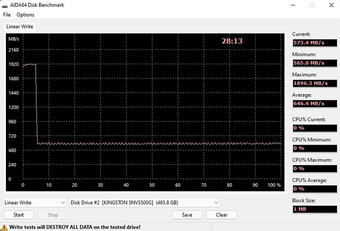 Kingston NV1 500GB SNVS500G — поведение диска крайне напоминает модель от Gigabyte с той лишь разницей, что за пределами SLC скорость оказывается выше и держится на отметке 570 МБ/c.