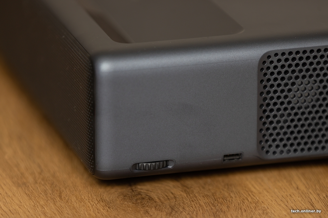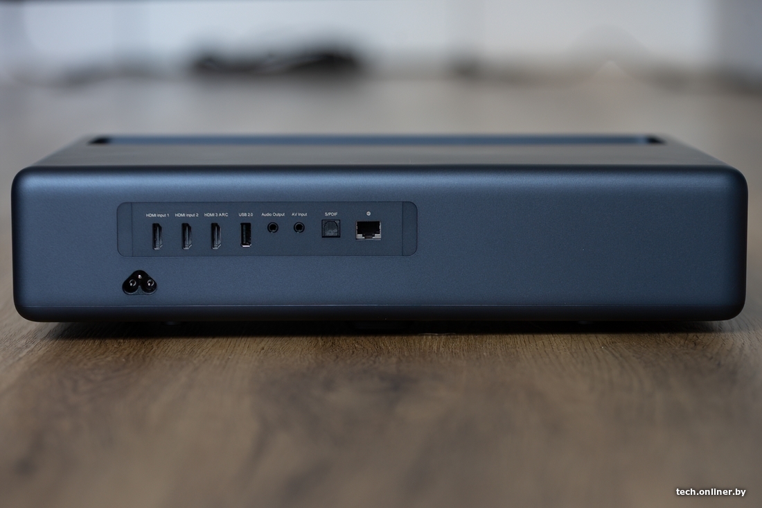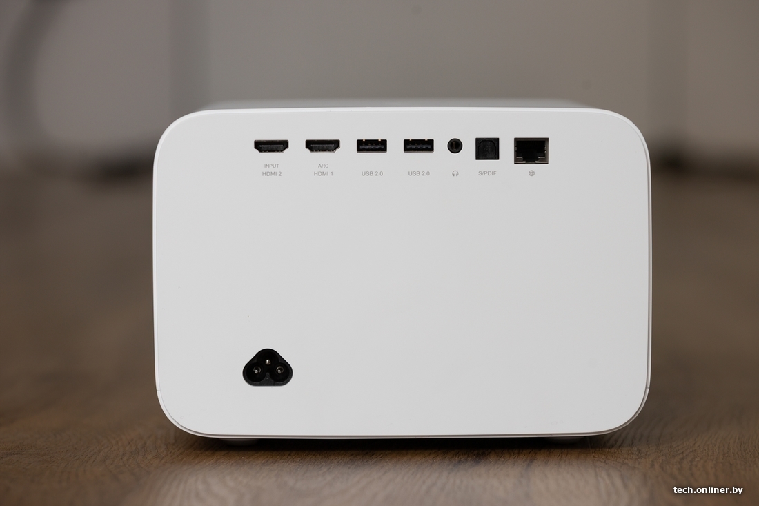 З цікавага — шмат партоў на любы густ. Тут тры HDMI, адзін USB-A (на жаль, толькі 2.0), выходны гукавы порт з падтрымкай сабвуфера, кампазітны порт, Ethernet і оптыка для гуку. Вядома, Wi-Fi і Bluetooth таксама ёсць. Знойдзем і IR-датчык прысутнасці чалавека, які зберажэ вашы вочы, калі раптам вырашыце паглядзець прама ў вобласць праекцыі. У такім разе яркасць праектара зменшыцца да мінімуму.