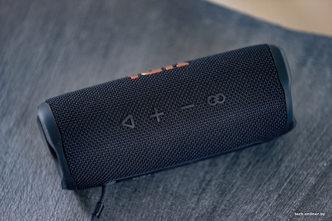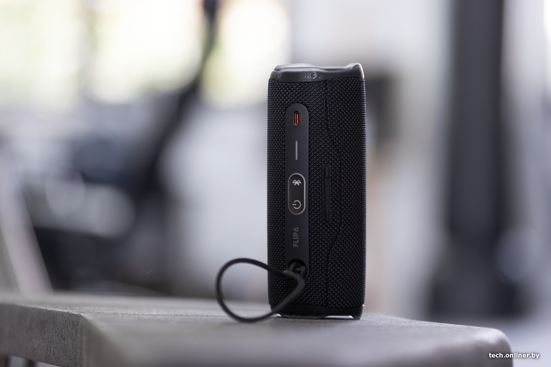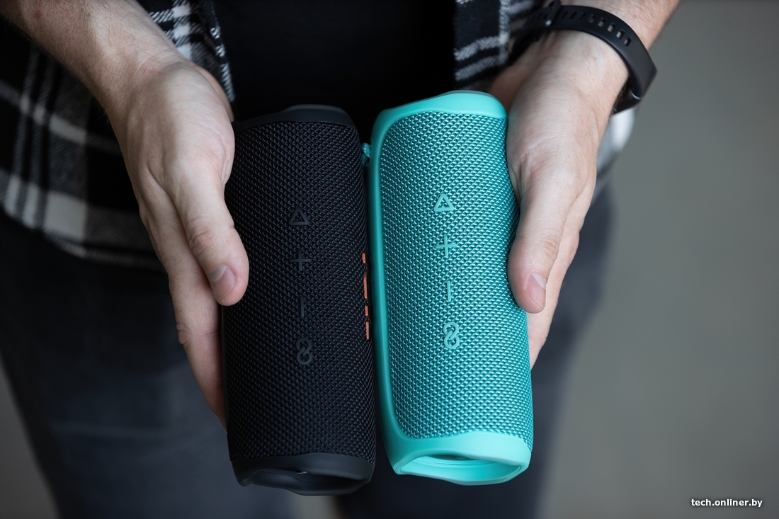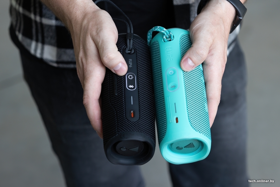 Flip 6 и 5 почти идентичны: небольшие цилиндрики с одинаковым набором кнопок и индикаторов и веселыми пассивными излучателями по бокам. Обе заряжаются через USB-C. У Flip 5 слегка вытянута задняя часть, как будто не до конца раскатанный край теста, что не дает ей крутиться на столе. У Flip 6 для устойчивости добавили маленький резиновый упор сзади. Ремешки для крепления есть у обеих моделей.