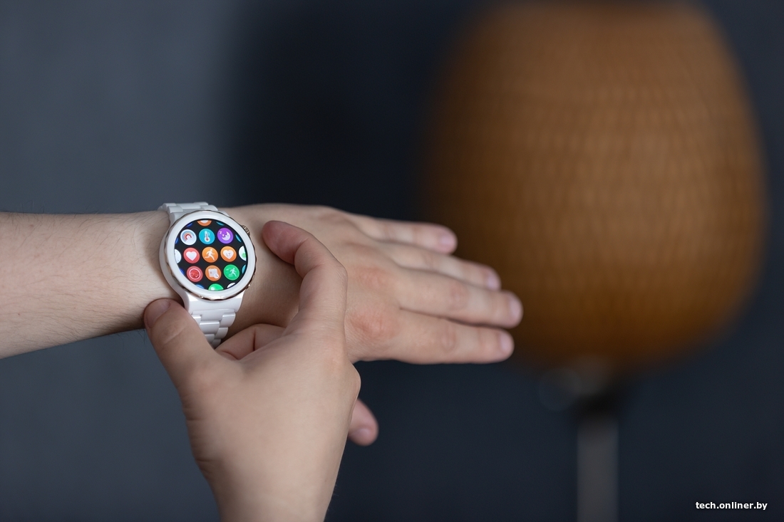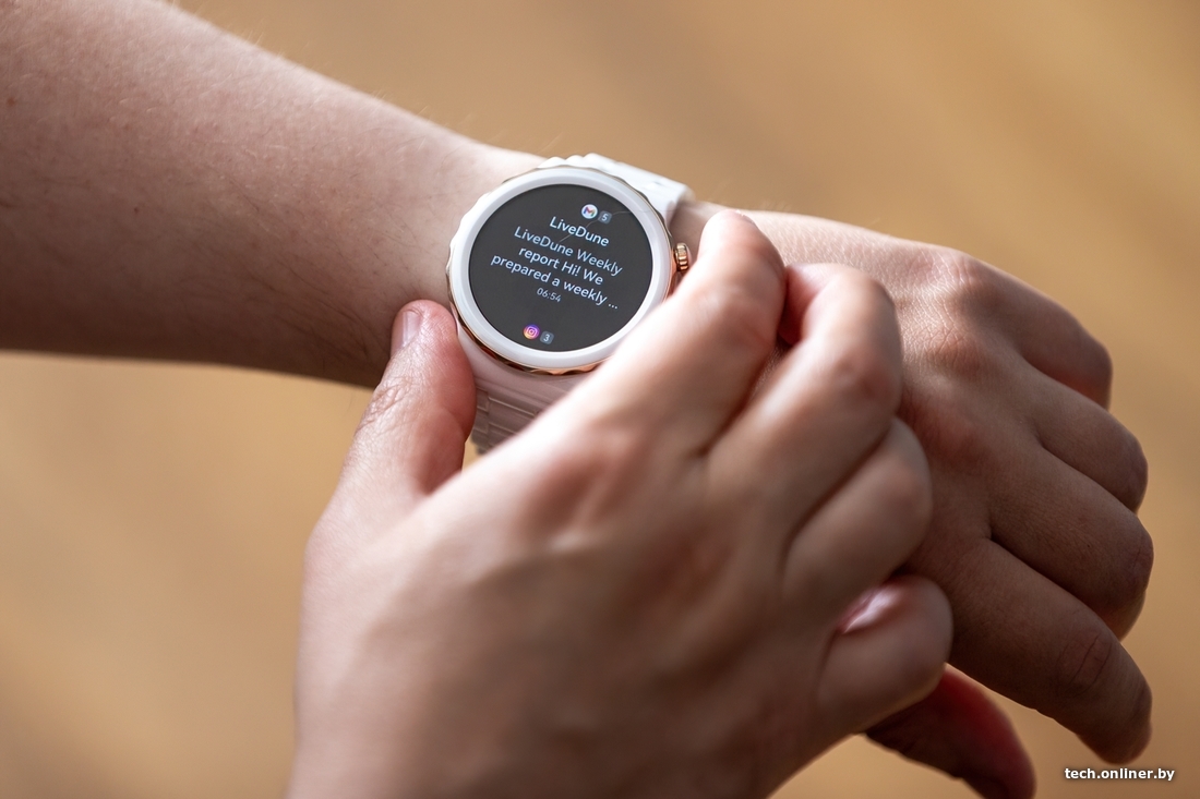 Наш Huawei Watch GT 3 Pro выкананы ў белым керамічным корпусе з такім жа белым керамічным бранзалетам. Ніякага пластыка, у адрозненне ад звычайнага Watch GT 3. І адчуваецца, і выглядае кераміка багата. Гладкі матэрыял проста прыемна памацаць, пакруціць у руках. Пры гэтым гадзіннік умерана цяжкі.
