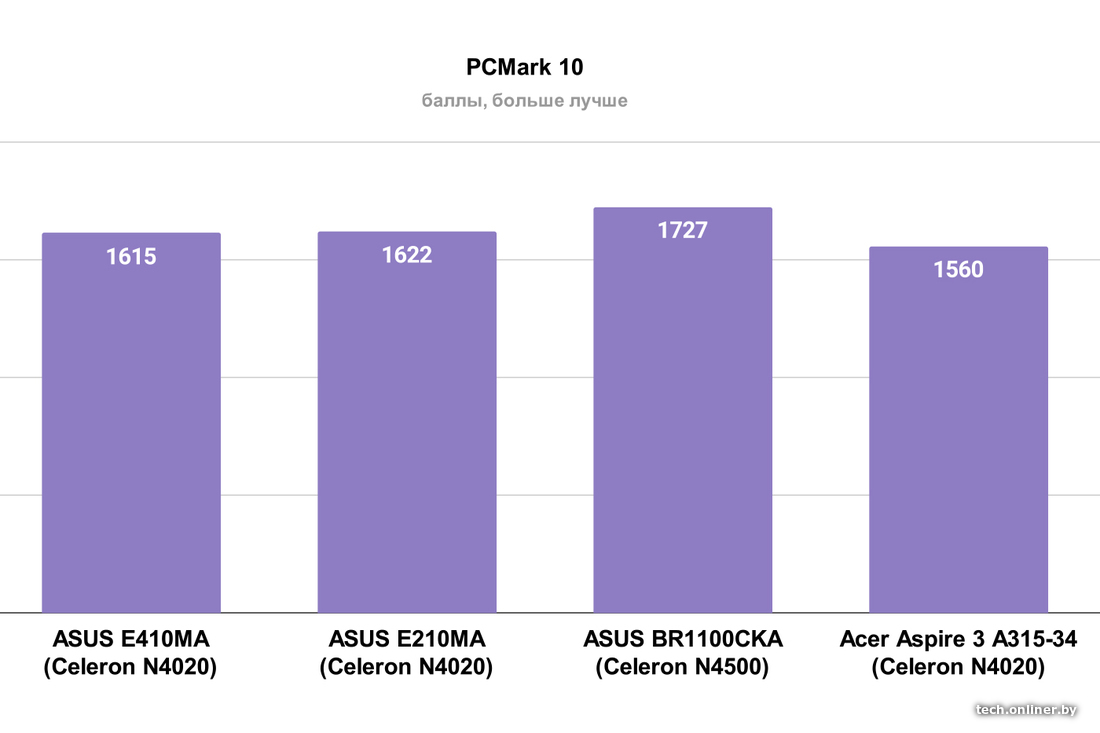 Все ноутбуки работают на 2-ядерных процессорах Intel Celeron и с 4 ГБ оперативной памяти. Потому их производительность идентична. В ноутбуке ASUS BR1100 процессор поновее, что отразилось на результатах тестов, но при реальном использовании это все тот же слабый Celeron, который даже не нужно охлаждать вентилятором. Поэтому все модели на тесте бесшумные и едва заметно нагреваются при высокой нагрузке.