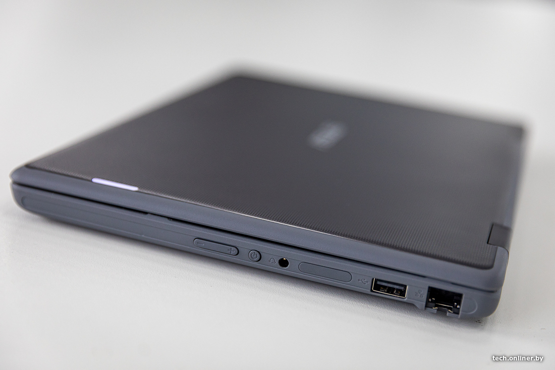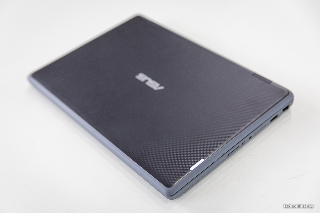 Кроме шуток, ноутбук выглядит странно, особенно из-за своих широченных рамок. Он толще, чем другие ASUS на обзоре, и в этом его главная фишка — повышенная прочность и влагозащита. Его производитель прямо позиционирует как ноутбук для учебы и для учебных классов. Хотя бы с этой точки зрения его можно рассматривать как первый ноутбук для ребенка.