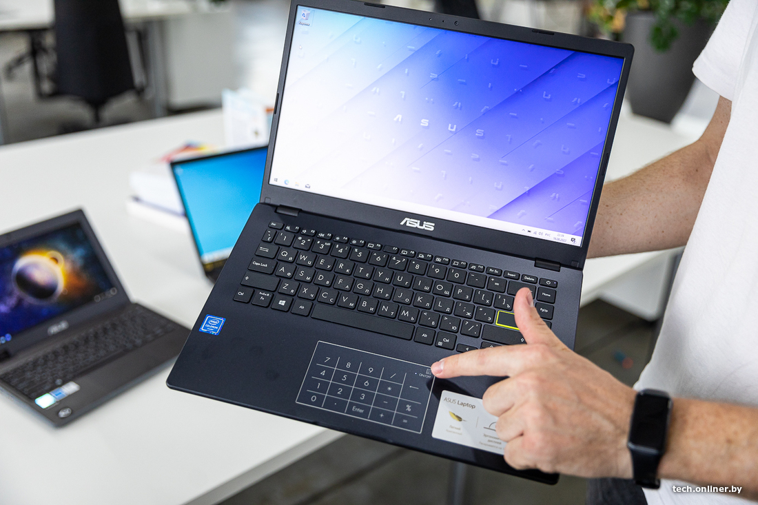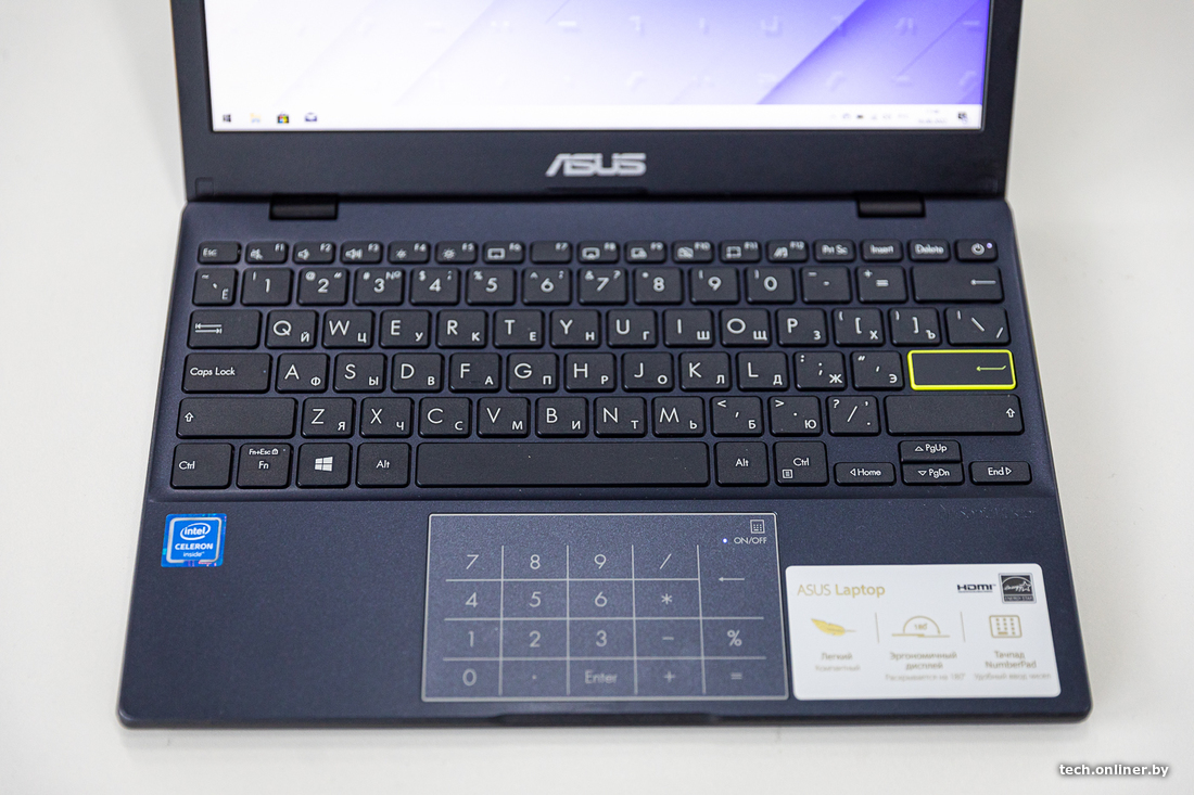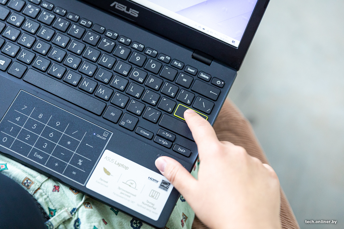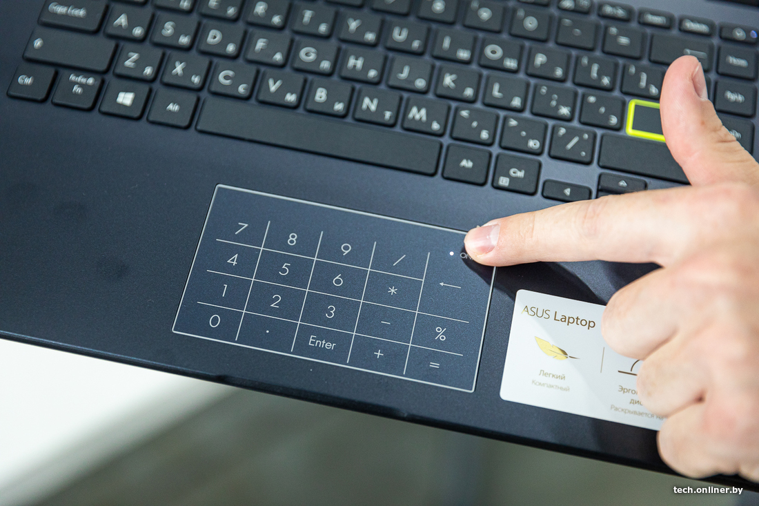 В моделях ASUS прямо на тачпаде разместили сенсорные цифры, причем по ним же не переключаясь можно двигать курсором. Штука довольно спорная, и в привычной работе быстрее было вводить цифры с помощью верхнего ряда. У сенсорных цифр к тому же отсутствует какой-либо фидбек вроде вибрации. Бывают и случайные нажатия на цифры. Специальной кнопкой в углу тачпада блок можно отключать, но включать надо долгим нажатием, что сбивает с ритма при вводе нескольких цифр. Возможно, дело привычки, и с большими объемами данных будет удобнее. Сама же функция любопытна тем, что больше нигде не встречается в компактных 14- и 11-дюймовых ноутбуках.