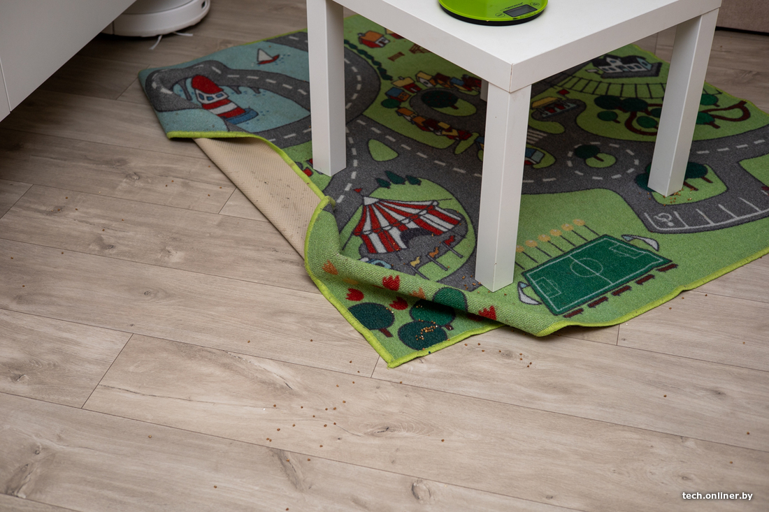 Придерживаясь сценария предыдущего сравнительного теста, проверяем работу датчиков падения. Раньше в некоторых пылесосах наблюдалась проблема с уборкой темных поверхностей и ковров: датчики их могли распознавать как пропасть, и робот старательно объезжал такие участки. Как видим ниже, в данной модели такой проблемы нет.
