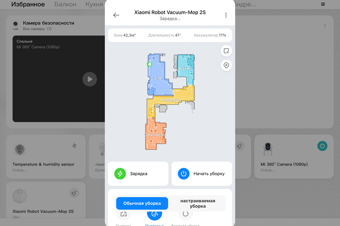 После построения карты пылесос предлагает запустить полную уборку. Ставим минимальные настройки мощности, без влажной. По уже построенной карте робот справился за 50 минут. Осталось еще 62 процента заряда аккумулятора. Неплохо.