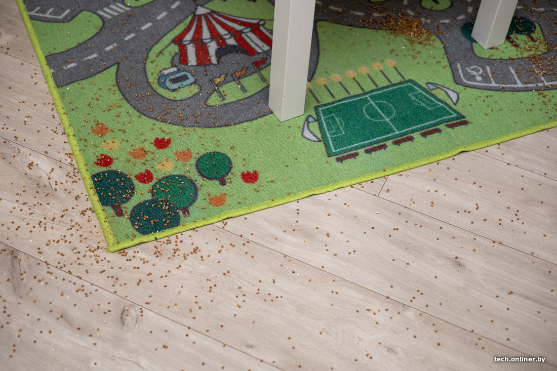Теперь на очереди традиционный гречневый дождь. Разбрасываем 100 грамм крупы по участку комнаты с небольшим ковром, запускаем зонированную уборку и взвешиваем контейнер до и после. Результат: пылесос собрал 88 грамм из 100, что вполне неплохо.