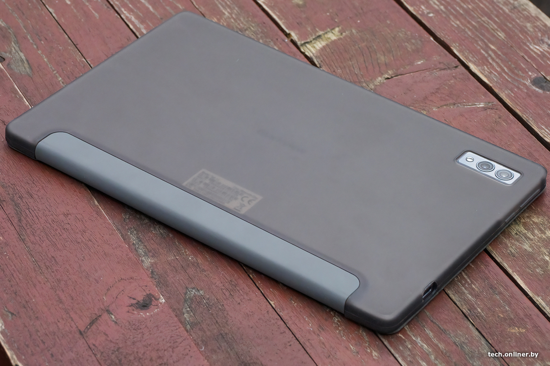 На правой боковине на пластиковой вставке расположен слот для двух SIM-карт (планшет поддерживает LTE) или одной симки и карты памяти MicroSD. На левой боковине — пара разнесенных по сторонам «грилей» стереодинамиков, между ними — углубления и контактная площадка для подключения док-станции (в комплекте есть обычный чехол-книжка), опциональная клавиатура — беспроводная. На верхнем торце слева — разъем USB Type-C, справа — кнопки включения и громкости, совсем на краю — 3,5-мм разъем.