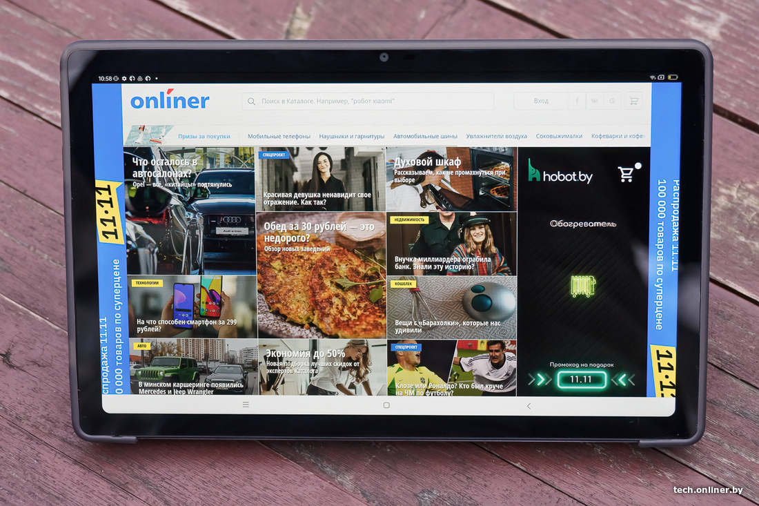Модель Blackview Tab 11 оснащена 10,36-дюймовым IPS-дисплеем с разрешением 1200×2000 точек (как бы 2K) и «модным» соотношением сторон 5:3 — экран вытянутый в угоду широкоформатным видео. Максимальная яркость, как следует из спецификаций, находится на уровне 360 нит. Это совсем немного, запаса нет, во время тестов пришлось оставить 100%, в вечернее же время можно вернуться к автоматическому регулированию. Зато не возникает вопросов к углам обзора: нет заметных смещений цвета и иных артефактов.