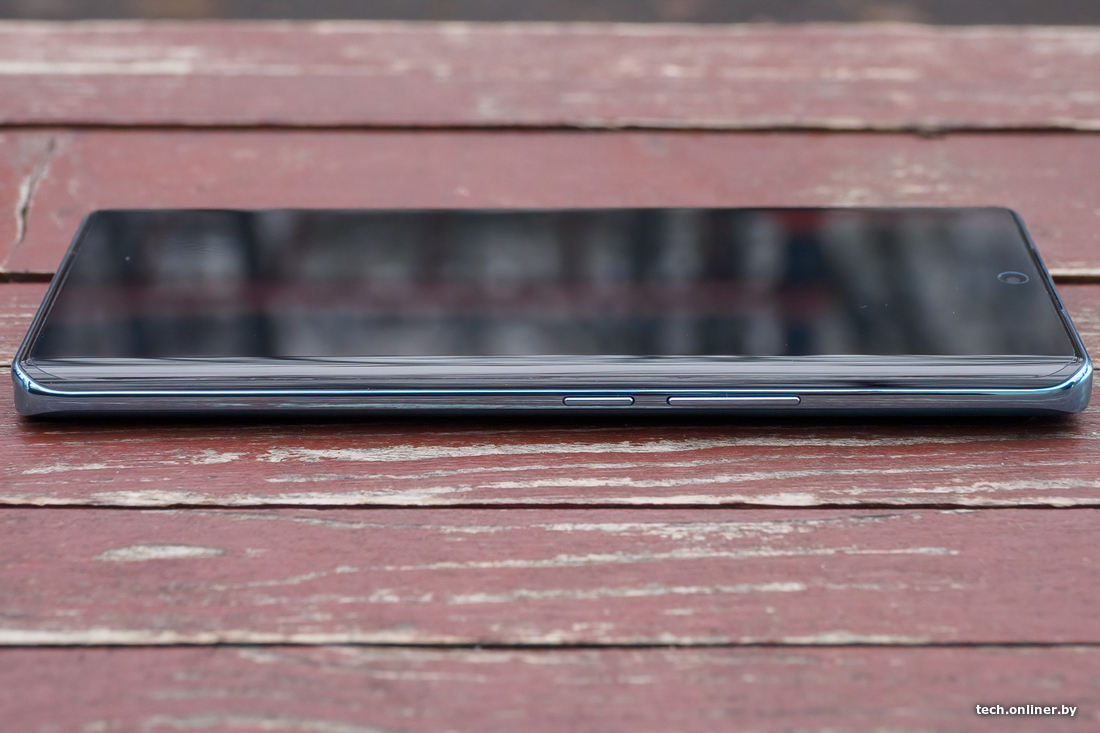На правой боковине находится качелька громкости и кнопка включения, на нижнем торце (слева направо) — слот для двух SIM-карт без возможности установить карту памяти, микрофон, разъем USB Type-C и гриль динамика. На левой боковине нет ничего. Не ясно, из чего сделана рамка: наверняка из металла, но верхний торец (который с надписью) — с пластиковой вставкой для обеспечения работы радиомодулей.