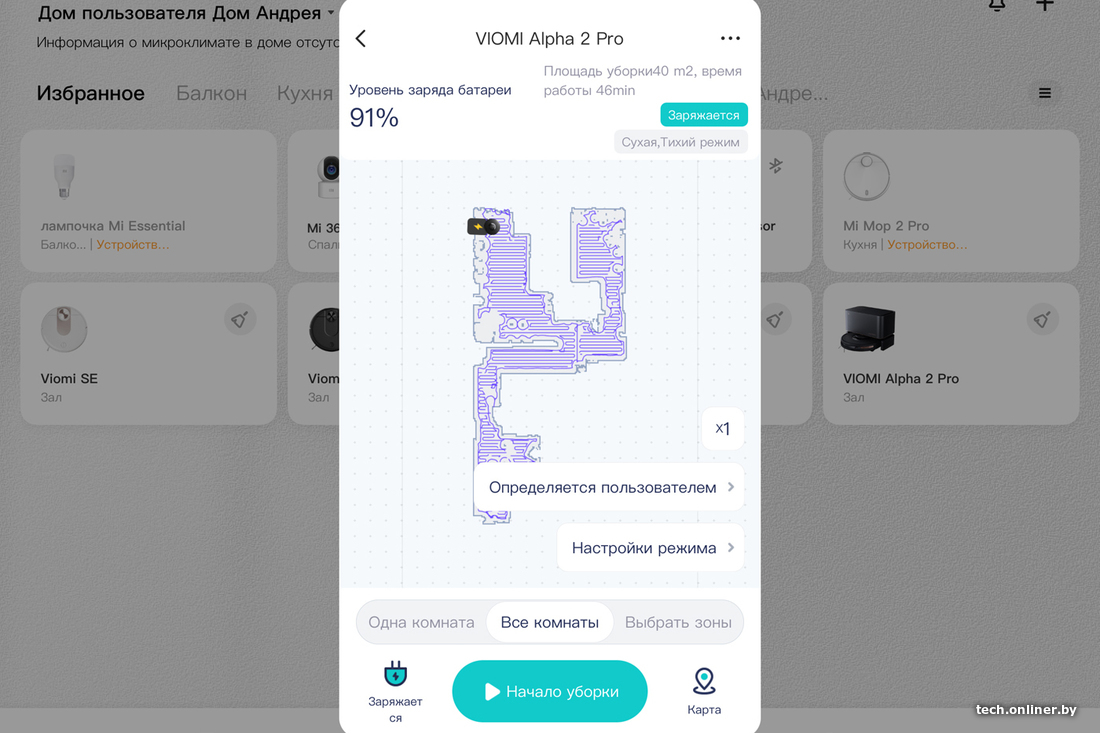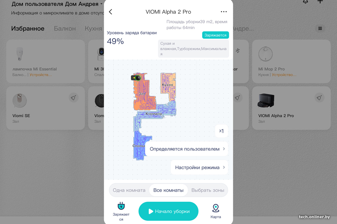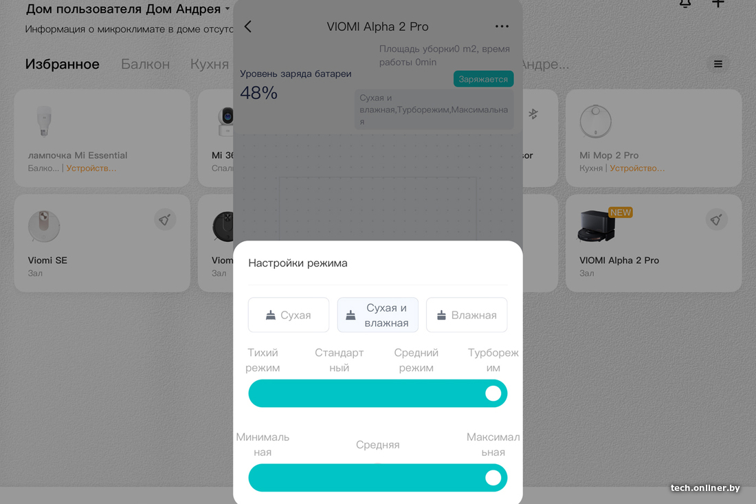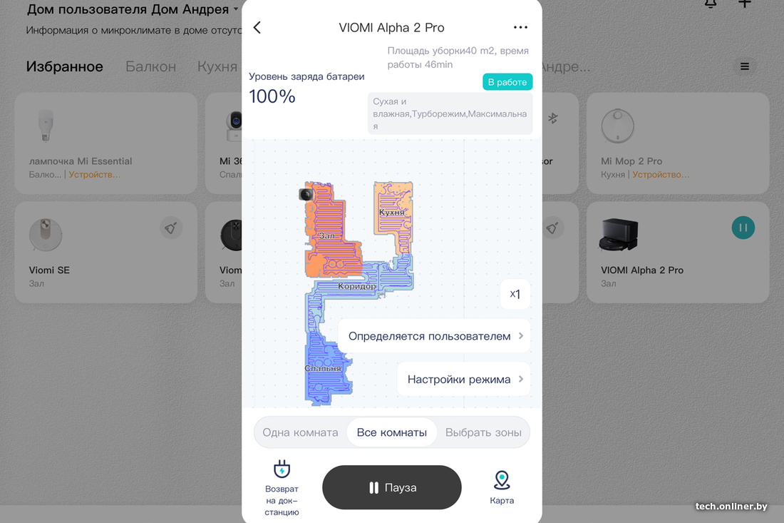 Alpha 2 Pro, помимо прочего, позволяет еще и настраивать режим уборки индивидуально для каждой комнаты. Удобно, если, например, у вас плитка в коридоре и ламинат в спальне, можно индивидуально регулировать уровень влажности.