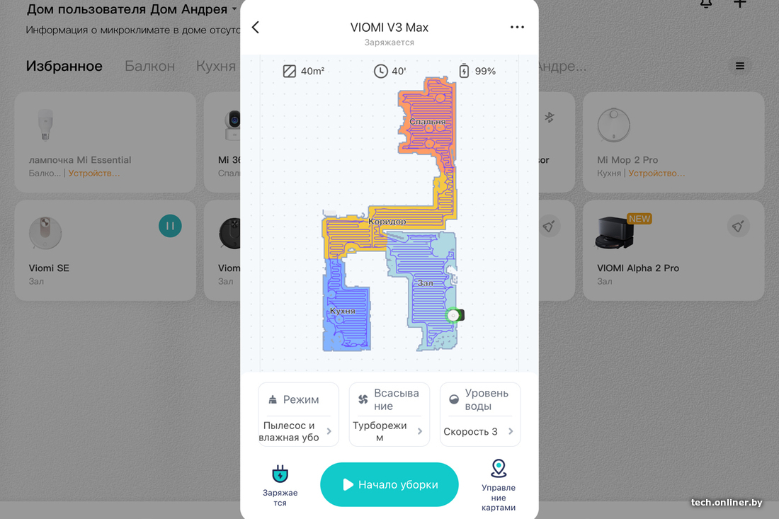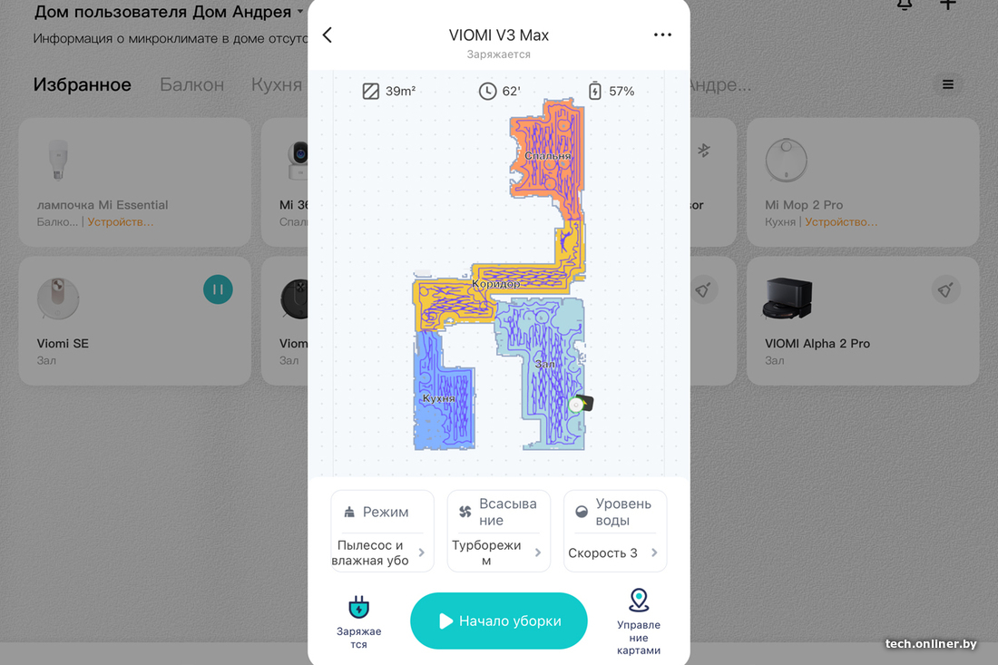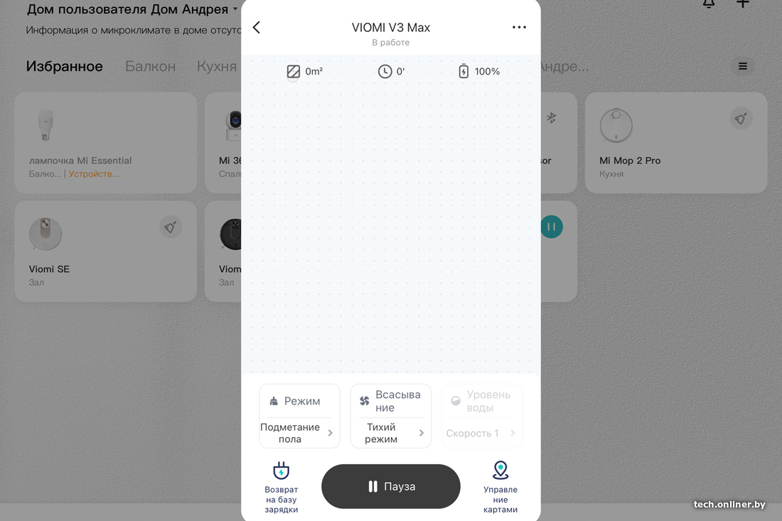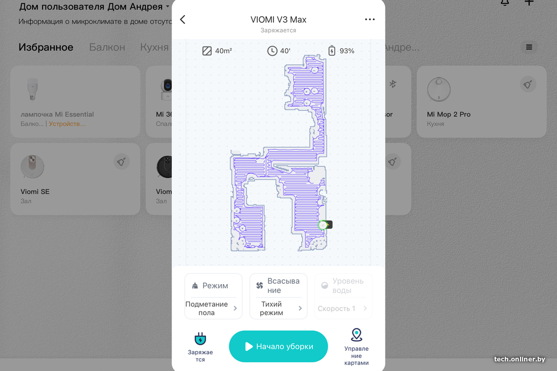Итак, для построения карты нужно сначала запустить полную уборку. Снимаем моющие насадки, выбираем режим минимальной мощности и смотрим, за сколько роботы справятся с двухкомнатной квартирой. Ну и на процент оставшегося заряда, само собой. Оба топовых робота будто вообще не напрягались — 93 и 91 процент батареи остался у V3 Max и Alpha 2 Pro!