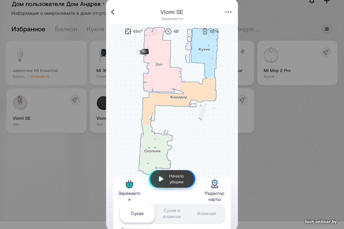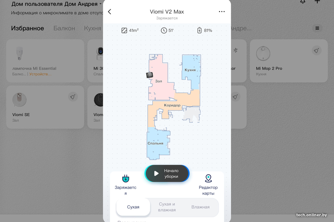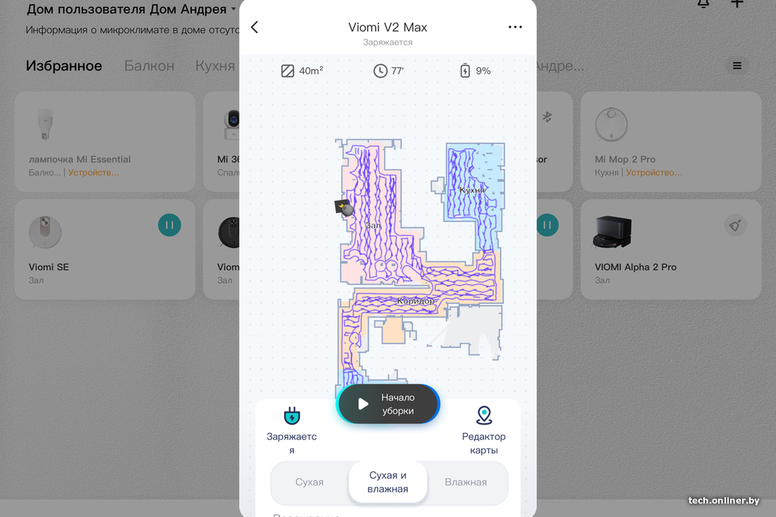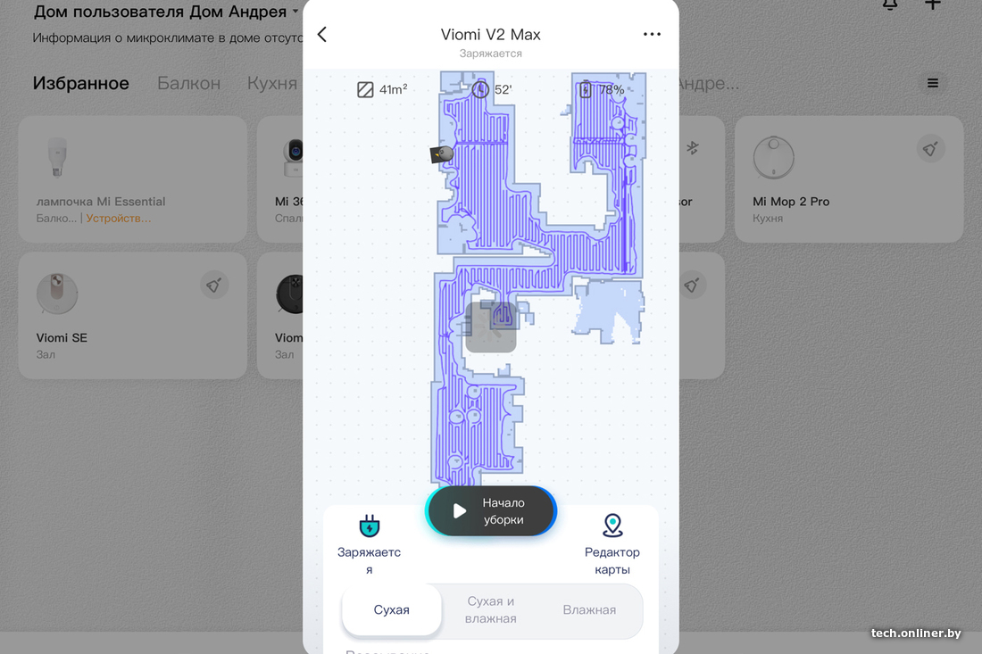Итак, для построения карты нужно сначала запустить полную уборку. Снимаем моющие насадки, выбираем режим минимальной мощности и смотрим, за сколько роботы справятся с двухкомнатной квартирой. Ну и на процент оставшегося заряда, само собой. Оба топовых робота будто вообще не напрягались — 93 и 91 процент батареи остался у V3 Max и Alpha 2 Pro!