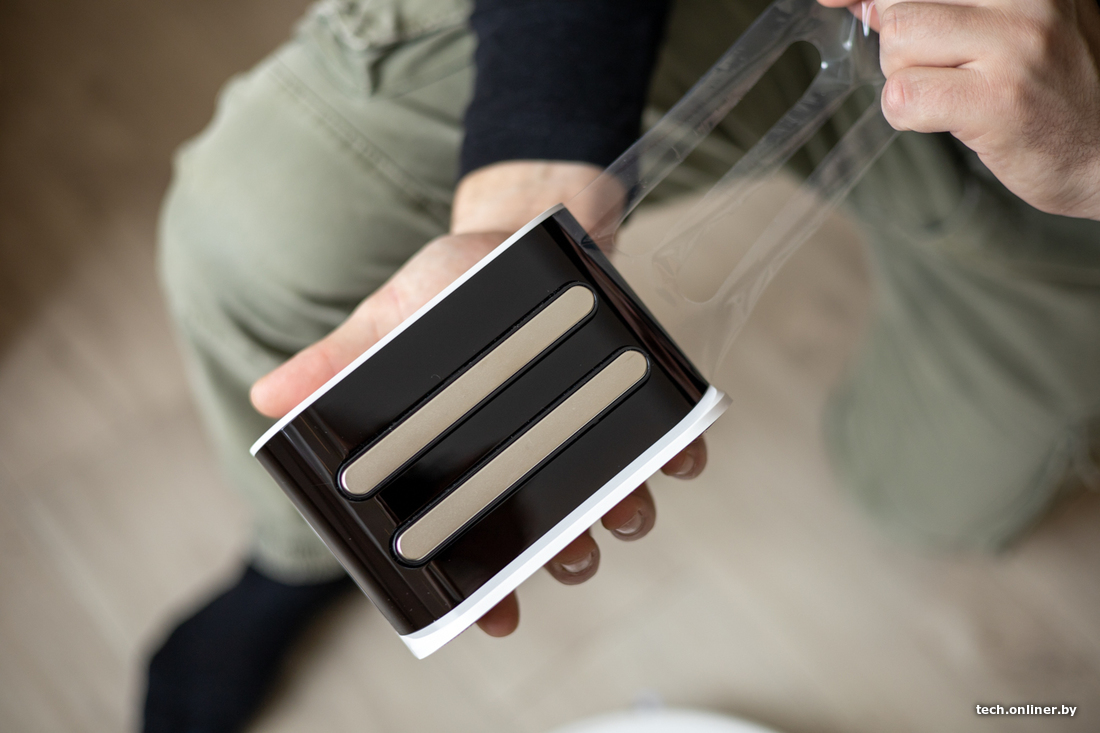 Из особенностей комплектации — есть 10 одноразовых насадок для влажной уборки (на фото не попали). Также понравилась конструкция контейнера, а именно мелочь в виде специальной закрывающейся шторки. Помогает не рассыпать мусор, если вдруг случайно наклонили емкость.