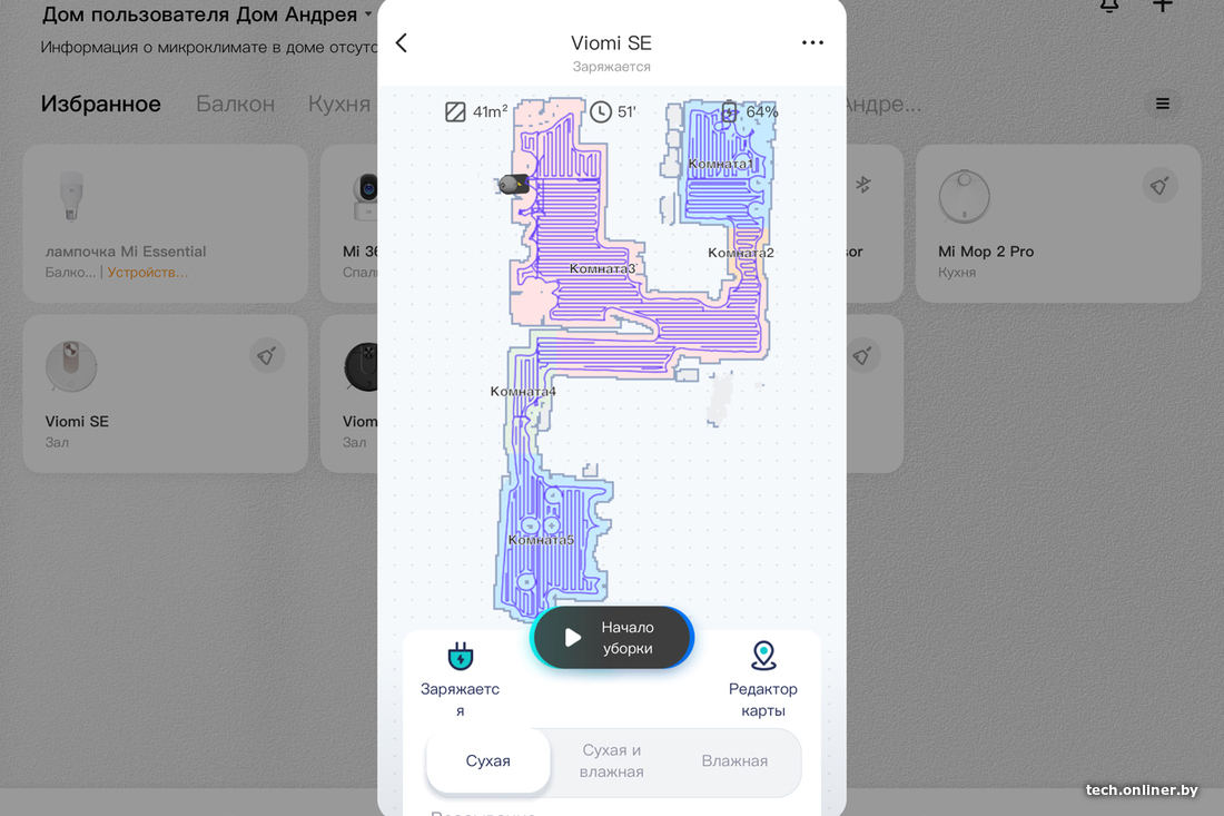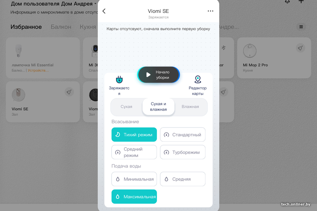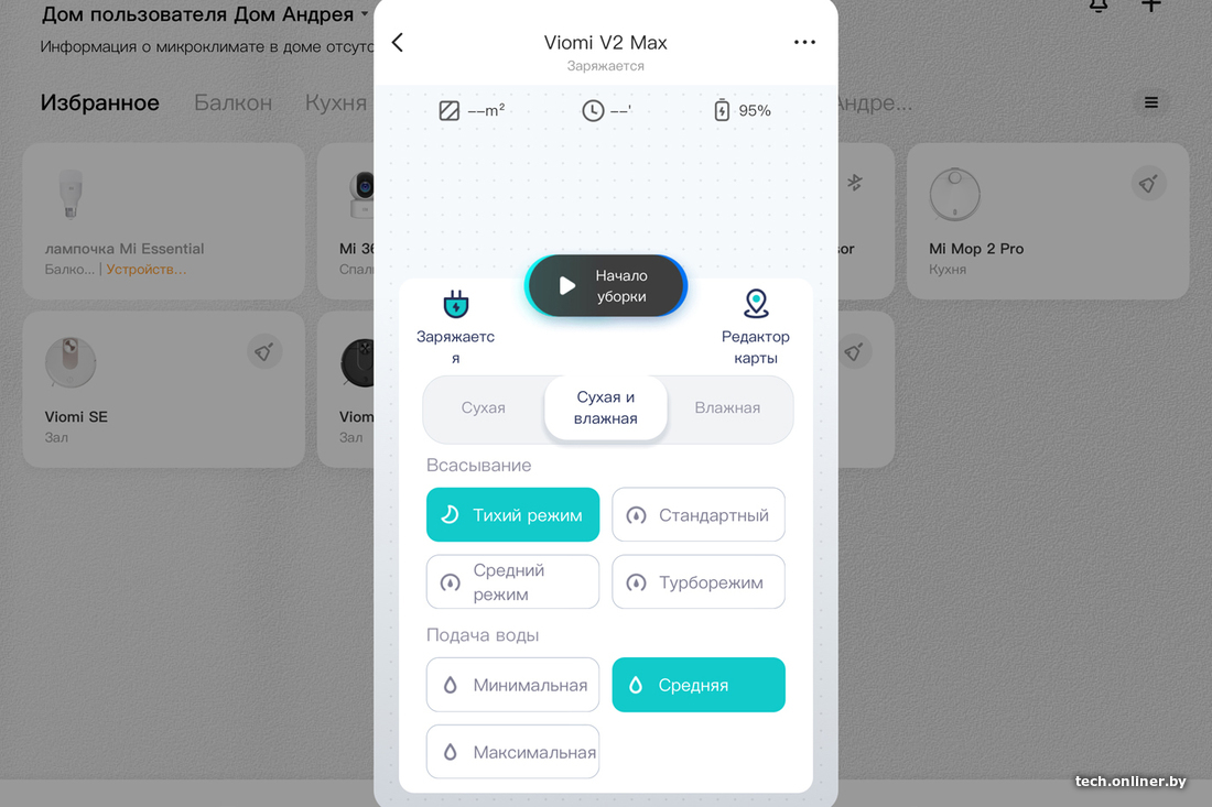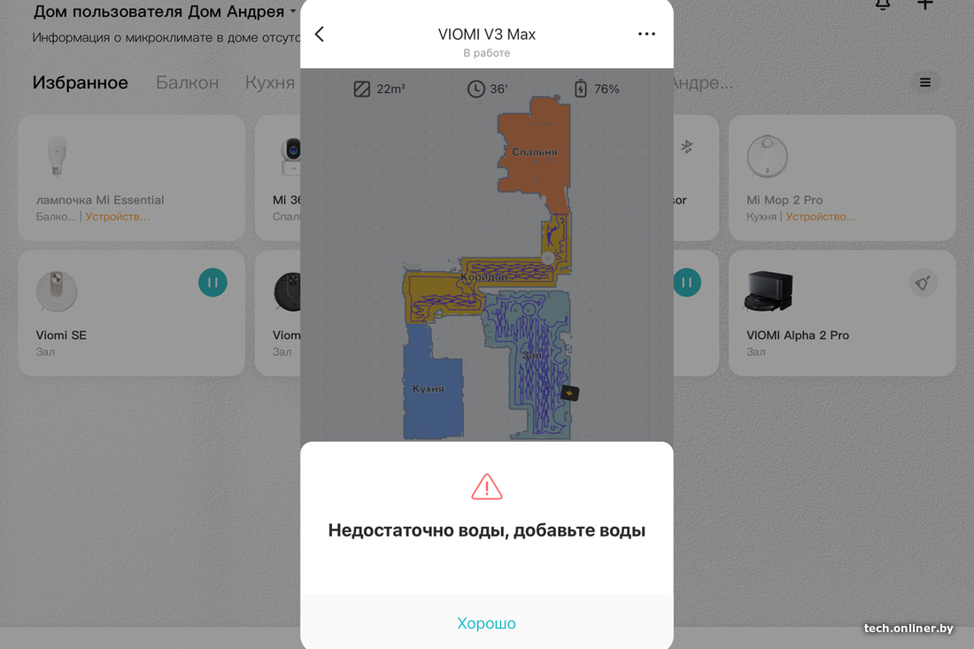 Пылесос не пасует перед ножками напольной сушилки и не застревает на порогах. А подача воды на максимальном режиме — 10/10. Это реально влажная уборка, а не просто протирка. Не хватает жидкости? Получите уведомление и голосовой сигнал, долейте — и робот продолжит уборку. В общем, очень интересный пылесос в своей ценовой категории. Благодаря емкой батарее, высокой мощности и сохранению нескольких карт робот-пылесос можно рекомендовать владельцев больших помещений и многоэтажных домов. Из недостатков разве что местами забавный перевод плагина и глянцевый черный корпус, собирающий отпечатки, но минусы не самые существенные.
