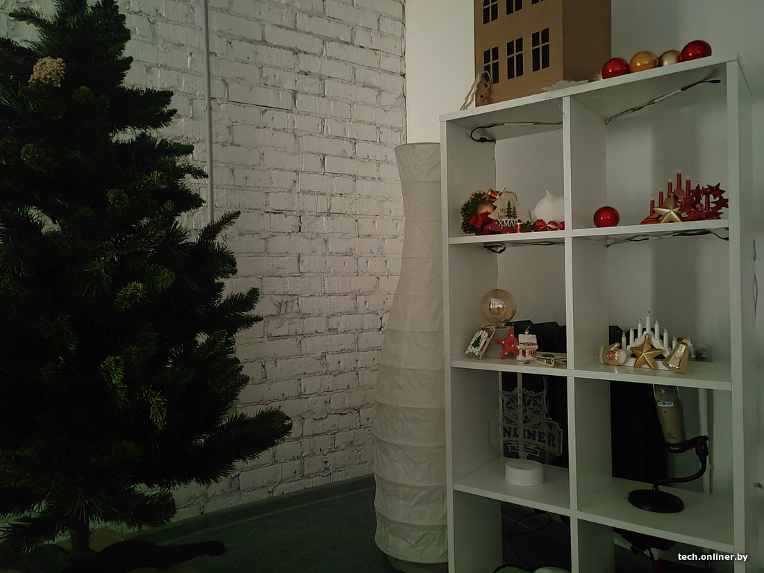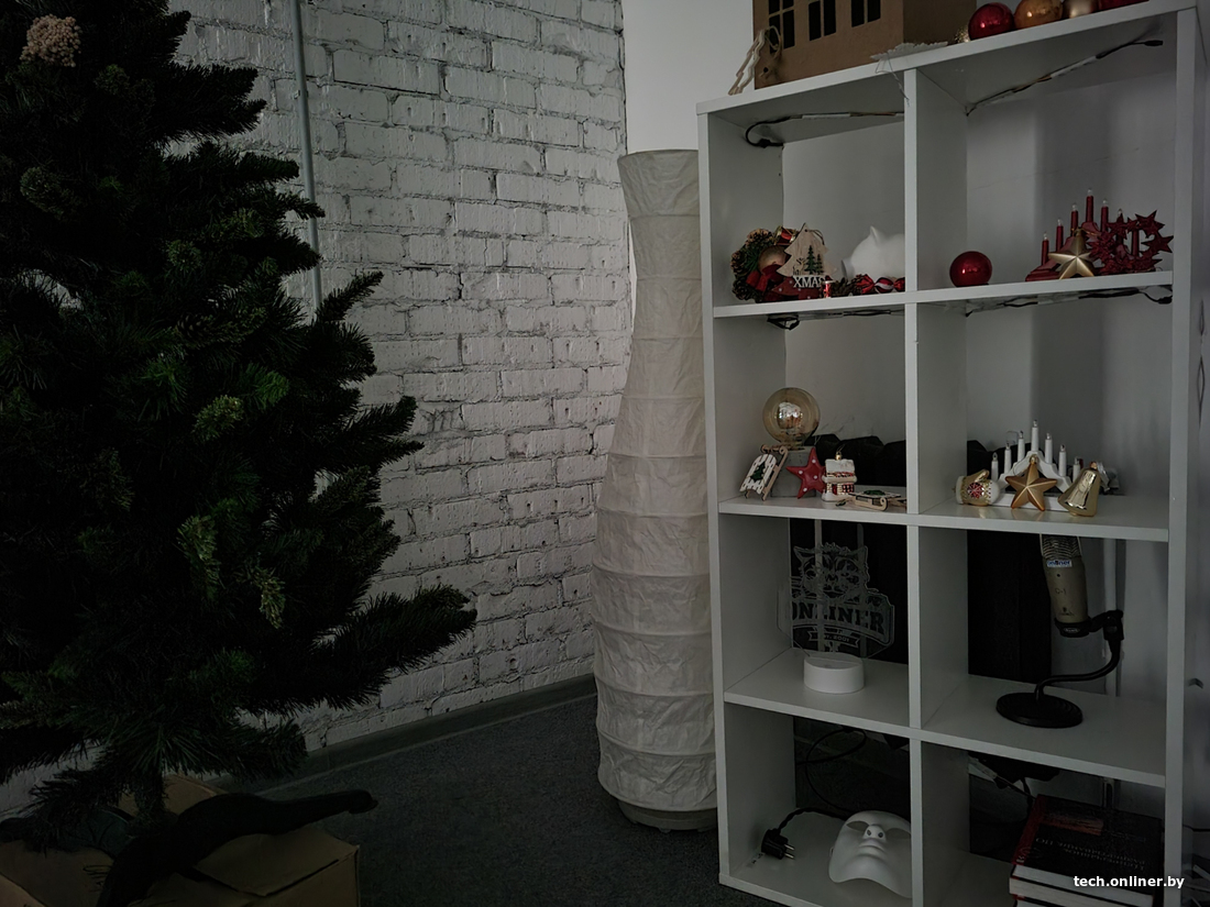 Цвет объектов в этой сцене невооруженным глазом различить было нельзя. Мы фокусировались именно на уголок шкафа с игрушками. iPhone оказался самым «шумным» в тенях, но с самым светлым кадром в целом. Xiaomi, кажется, достал из теней меньше всего деталей и добавил зеленоватый оттенок. Ни один алгоритм не отработал сцену без явного недостатка. Конечно, легко придираться к кадрам с рук во мраке.
