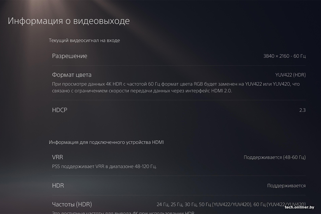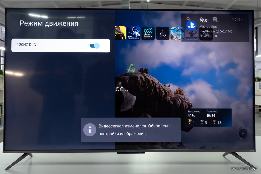 Игровой режим («Мастер игр») активируется сам при запуске игры только на консоли. Есть небольшой геймбар с парой быстрых настроек и поддержка HGIG. Телевизор iFFALCON Q72 хорошо подходит для современных игровых консолей. PlayStation 5 распознала все поддерживаемые режимы и функции, включая VRR и разрешение 1440p.