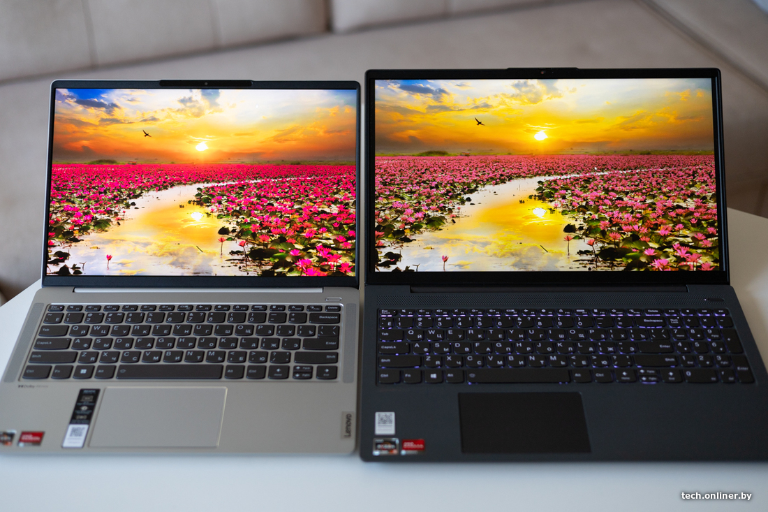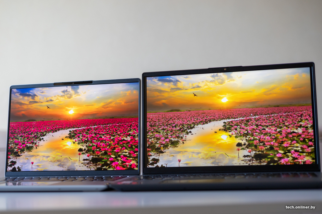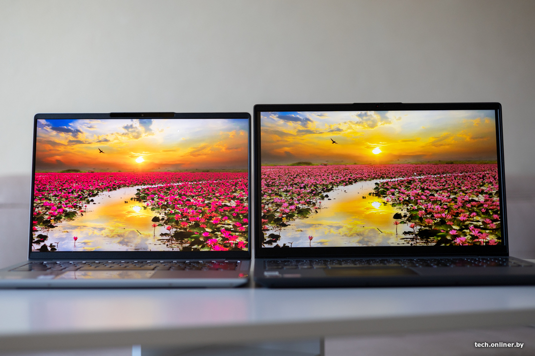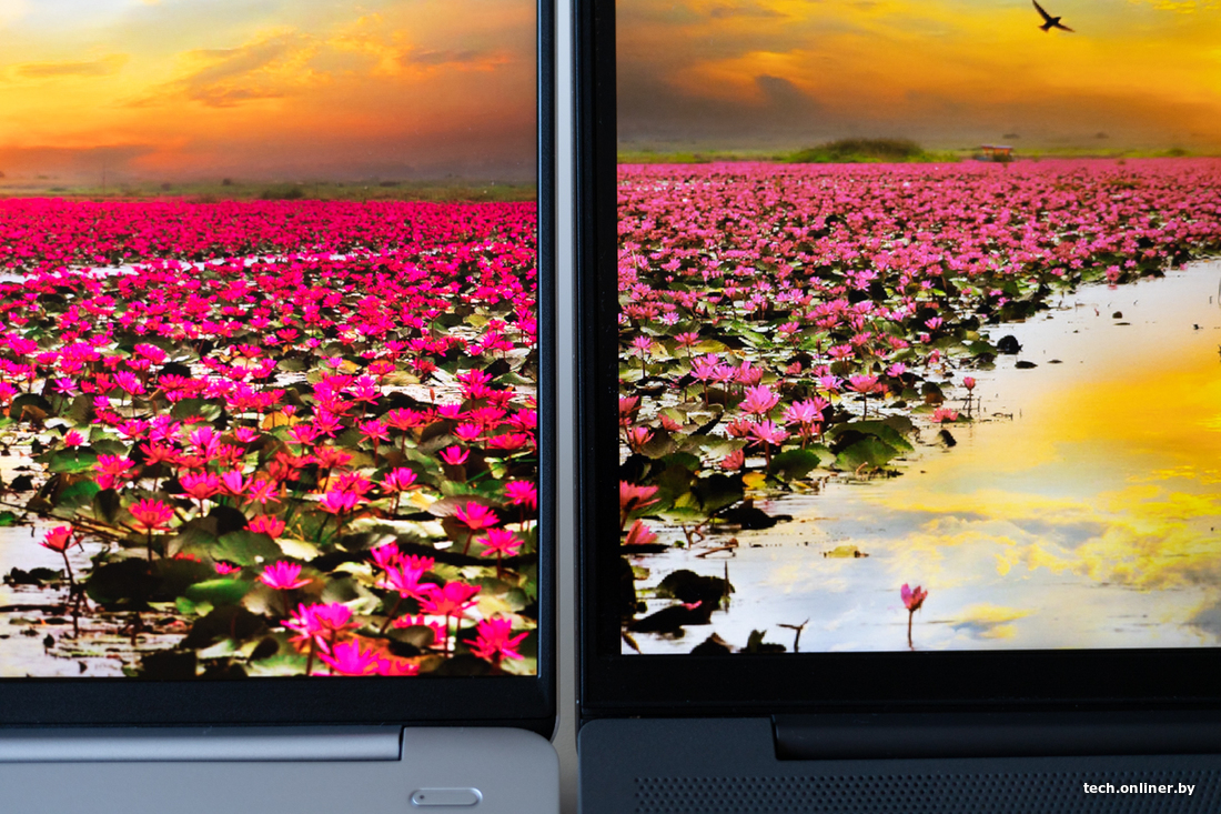 Сам же дисплей поражает качеством. Широкие углы обзора IPS-панели, высокая яркость и отличная цветопередача, обеспеченная поддержкой широкого цветового охвата 100% sRGB. Преимущество в цветах хорошо показано на сравнении ниже, где оба ноутбука с яркостью 300 нит, но IdeaPad 5 Pro (слева) имеет более сочные и красивые цвета, чем IdeaPad 5 (справа).