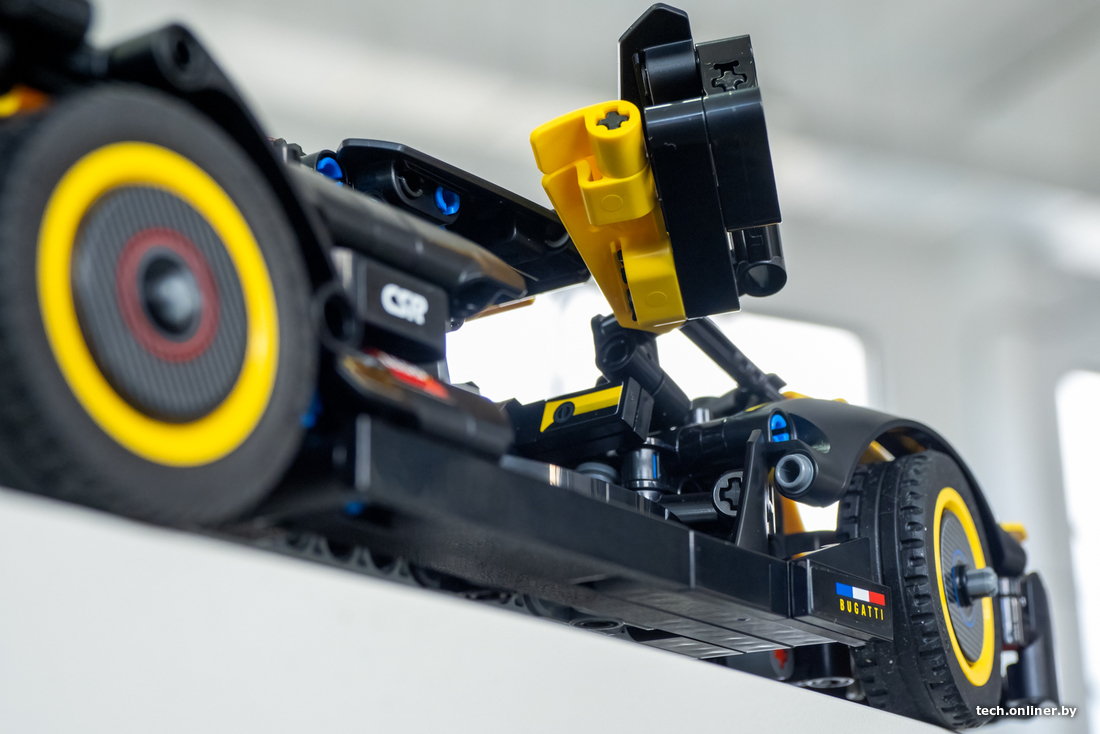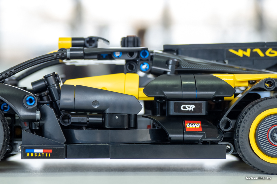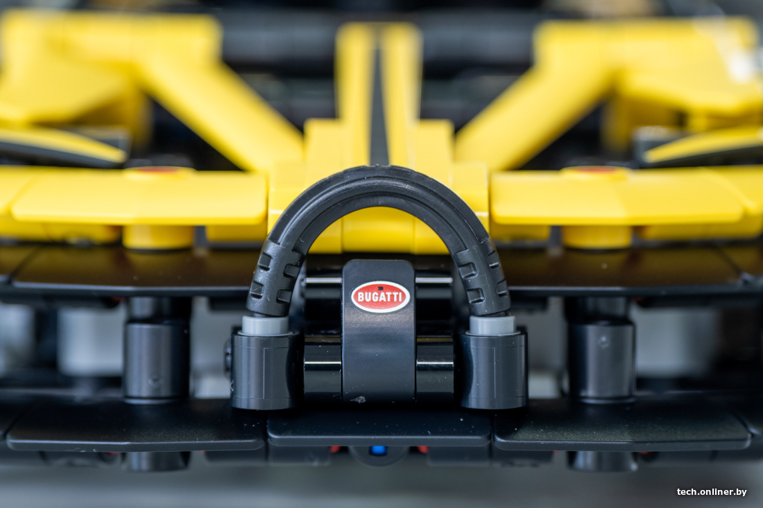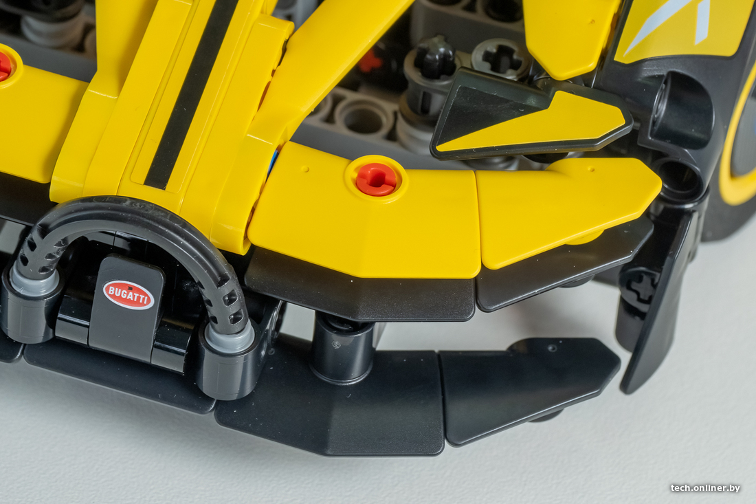 Задняя часть болида выглядит великолепно: длинный плавник, большое антикрыло с логотипами Bugatti, X-образные огни и двойные выхлопные патрубки. Использование «X» не случайность, а отсылка к экспериментальному пилотируемому самолету Bell X-1, который первым преодолел звуковой барьер в 1947 году. Так Bugatti намекает нам на невероятные скорости своей машины, теоретически даже больше 500 км/ч. А модель LEGO будет вам об этом скромно напоминать с полки.