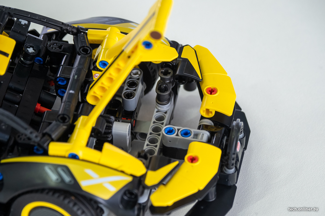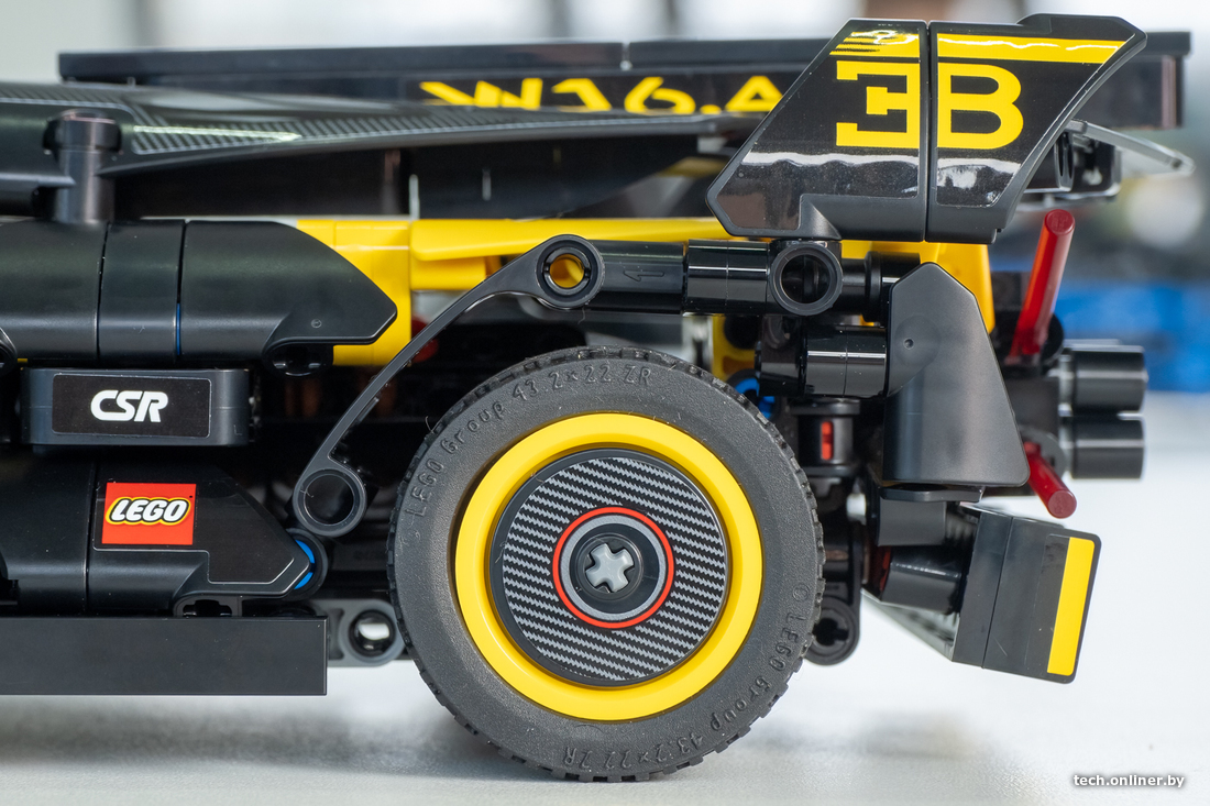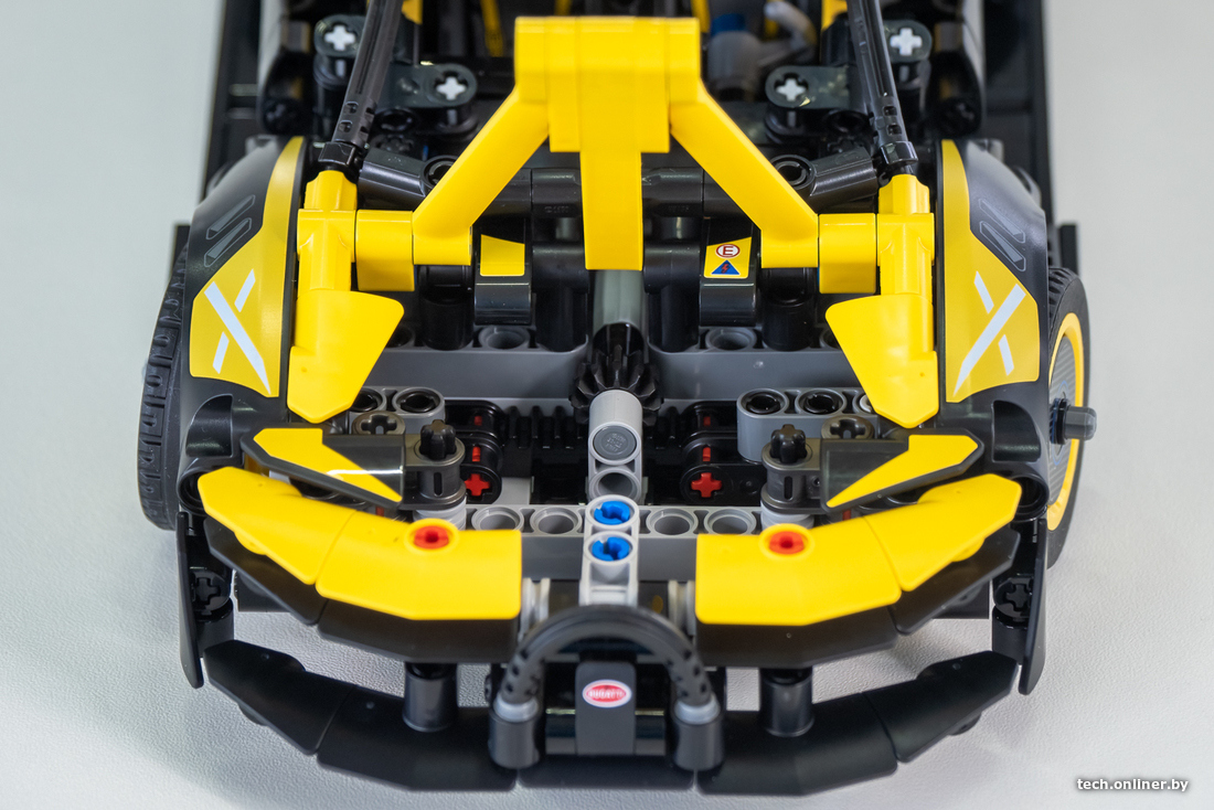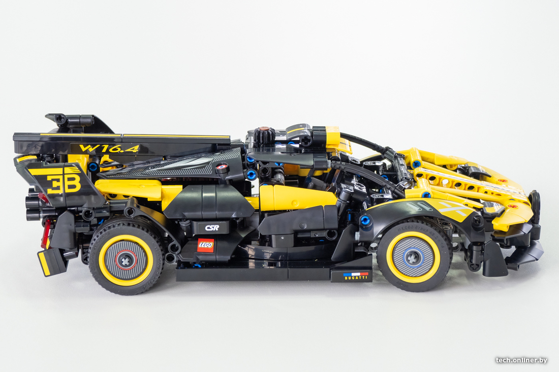 Задняя часть болида выглядит великолепно: длинный плавник, большое антикрыло с логотипами Bugatti, X-образные огни и двойные выхлопные патрубки. Использование «X» не случайность, а отсылка к экспериментальному пилотируемому самолету Bell X-1, который первым преодолел звуковой барьер в 1947 году. Так Bugatti намекает нам на невероятные скорости своей машины, теоретически даже больше 500 км/ч. А модель LEGO будет вам об этом скромно напоминать с полки.