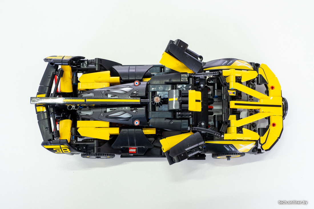 В собранном виде Bugatti Bolide — это черный гоночный автомобиль с яркими желтыми акцентами, длиной 31 см и шириной 13 см. Дизайнеры LEGO старательно переносили аэродинамику прототипа, изгибы кузова и воздухозаборника. Спереди заметны фирменная решетка радиатора Bugatti и принтованные арки, которые почему-то отличаются оттенком желтого цвета от соседних деталей капота. В отличие от оригинала, в LEGO Bugatti Bolide почти не используется «карбоновый» дизайн. Лишь на воздухозаборнике и на двух больших панелях, прикрывающих двигатель.