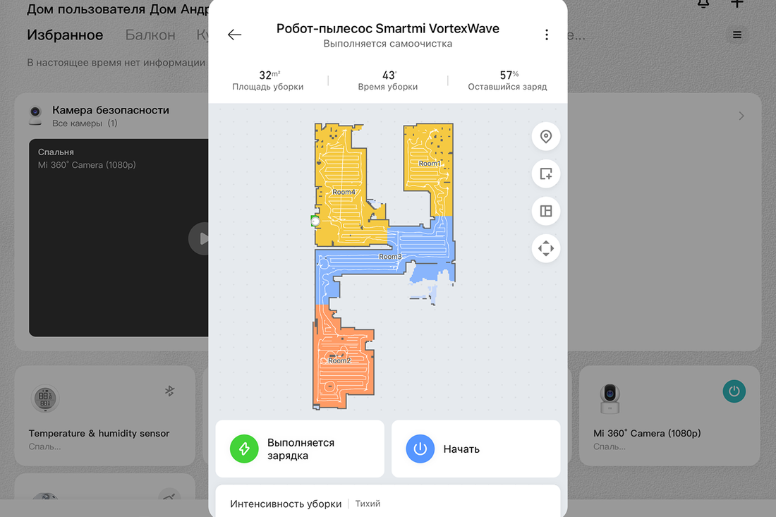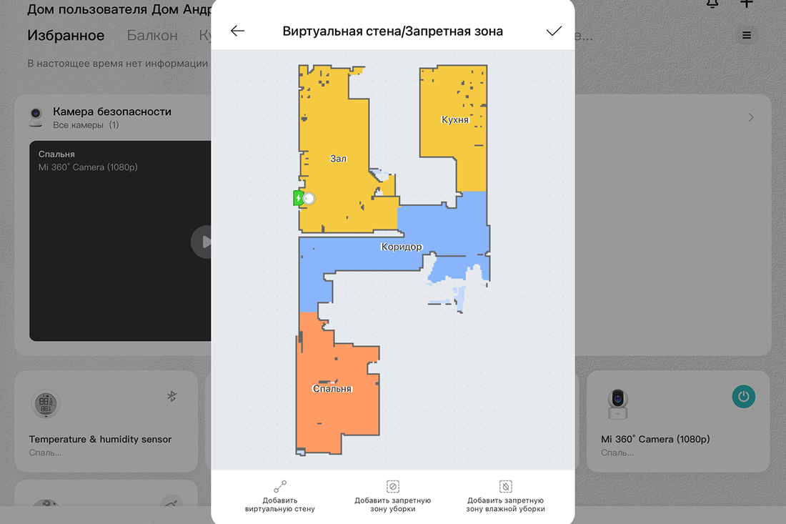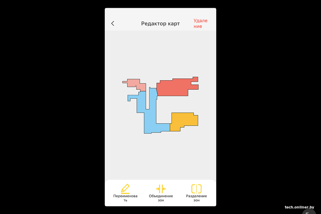 Для первого построения карты робот-пылесос должен полностью завершить уборку. Затем есть возможность переименовать комнаты, разделить их или, наоборот, объединить. Карта строится не слишком точно, да и, забегая вперед, часто слетает: уборку зоны запустить ни разу так и не удалось, робот-пылесос почему-то теряется и не доезжает до участка. Но покомнатная уборка работает, здесь вопросов нет.