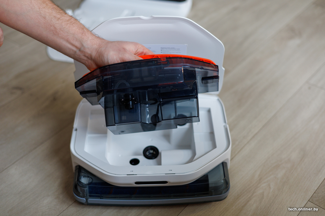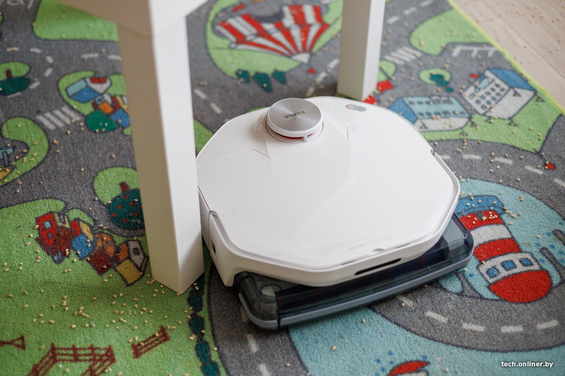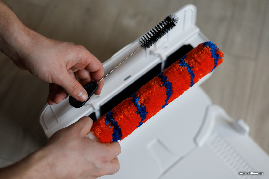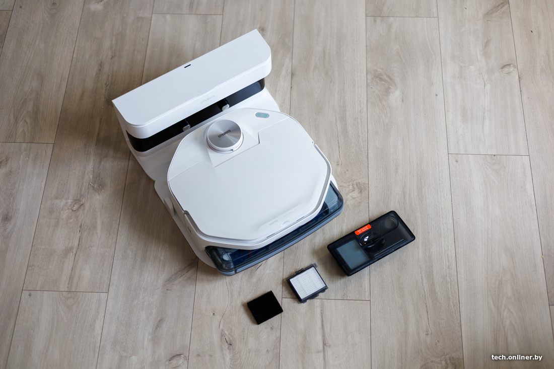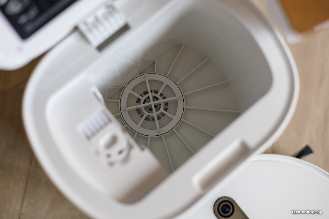 За навигацию отвечает лидар, что в теории должно ускорять построение карты и облегчать объезд препятствий даже в темных уголках квартиры или дома. Заявленное время работы от одного заряда аккумулятора — почти два часа. В базе сверху есть специальный отсек, где можно хранить сменный валик и приспособления для чистки робота.
