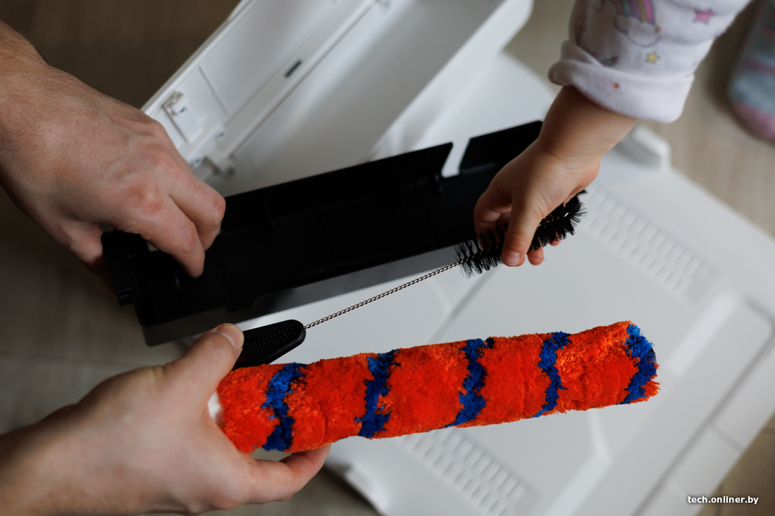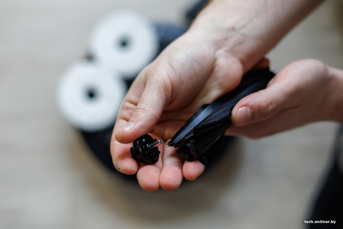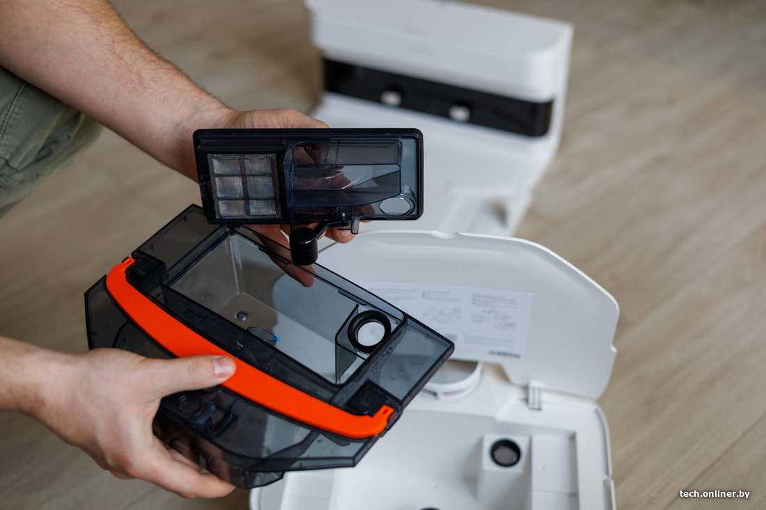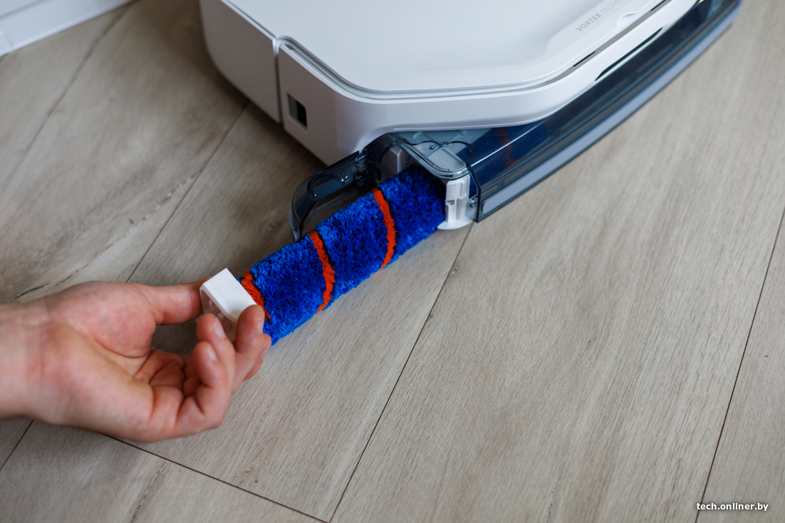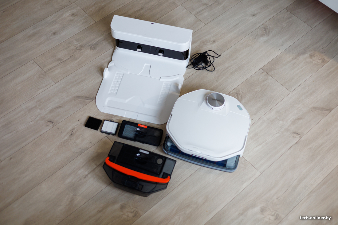За навигацию отвечает лидар, что в теории должно ускорять построение карты и облегчать объезд препятствий даже в темных уголках квартиры или дома. Заявленное время работы от одного заряда аккумулятора — почти два часа. В базе сверху есть специальный отсек, где можно хранить сменный валик и приспособления для чистки робота.