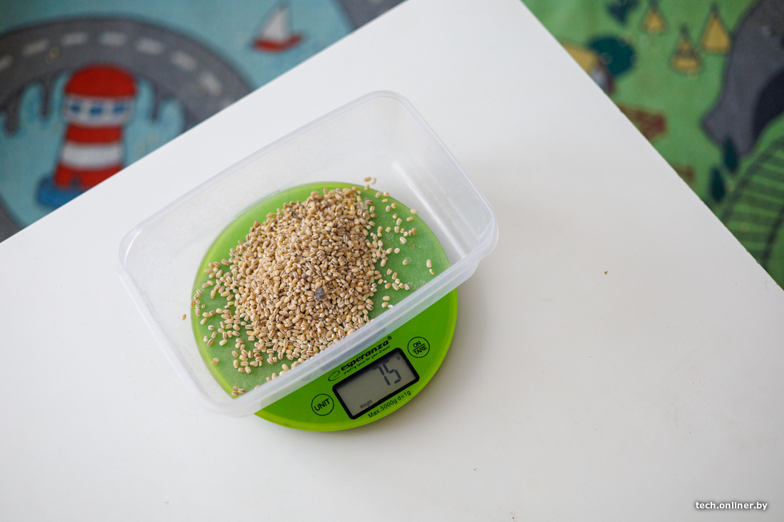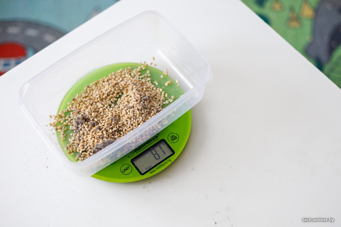 Снова возвращаемся к сухой уборке, на этот раз зонированной. Тест на количество собранного мусора. Рассыпаем перловую крупу, 100 грамм, на ковре без ворса и ламинате, около журнального столика. Условия стандартные, примерно так мы тестируем все роботы-пылесосы. Результат — 81 грамм из 100 робот-пылесос собрал. Средне: не лучший результат, но и не безнадежный.