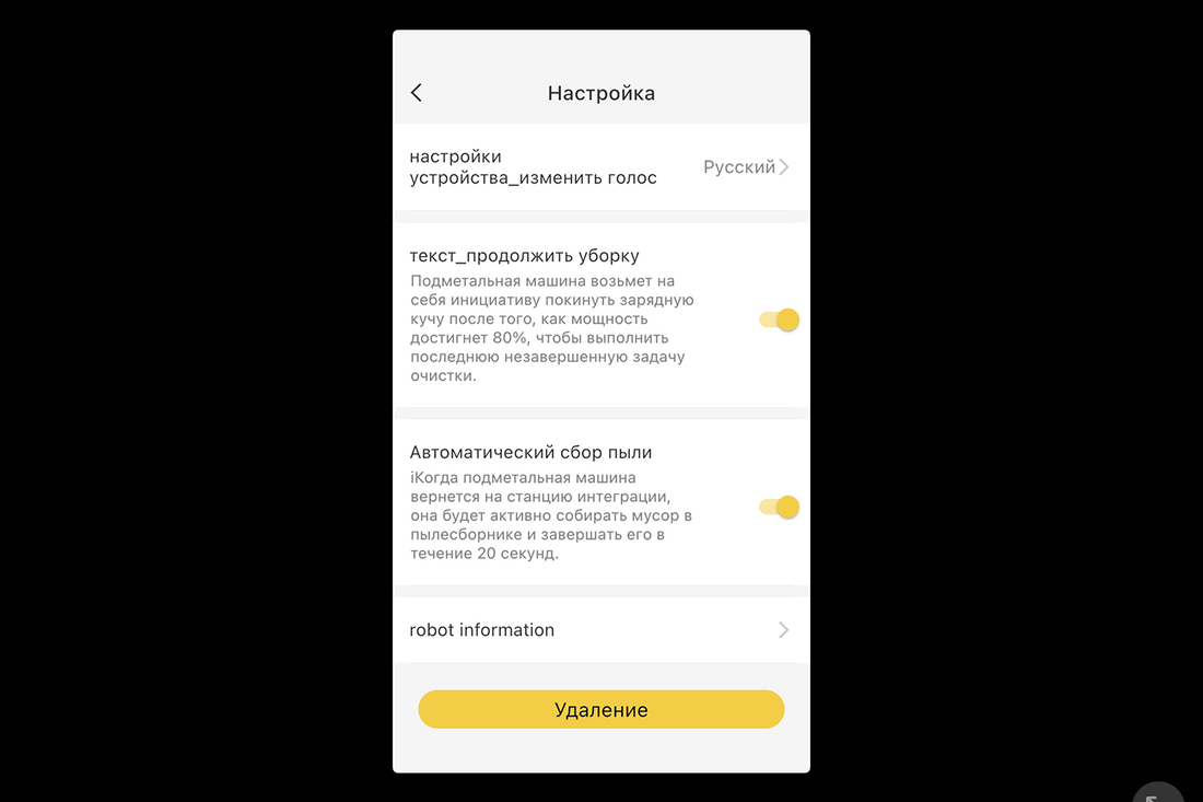 За ориентацию в пространстве отвечает широкоугольная камера, а также набор датчиков снизу и спереди. Управляется робот-пылесос кнопкой с корпуса или с помощью мобильного приложения. Последнее, увы, это не привычный большинству Mi Home, а свое, родное, Deerma. Не слишком удобное, да и с переводом явно есть вопросы. В общем, умный дом Mi Home с этим устройством вы не построите.