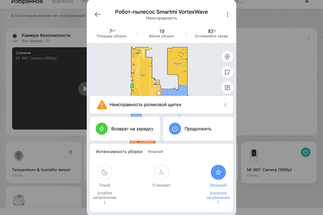 Следующий тест — уборка комбинированная, на максимальной мощности. И тут все неоднозначно. Во-первых, несколько раз случилась остановка с сообщением об ошибке щетки. Никаких загрязнений, волос, предметов на ней не было, тщательно все проверили. После нескольких снятий и установок на место робот продолжил свое дело. Легкий детский ковер было решено чуть откинуть в угол, чтобы он не запутывался и не мешал проезду. Почему-то это сбило умные системы робота с толку: больше 10 минут пылесос катался в одном углу, пытаясь выбраться (видно по скриншотам ниже). Да, это небольшое изменение обстановки, но по опыту предыдущих обзоров модели с лидаром всегда безукоризненно справлялись с такими ситуациями. В дальнейшем использовании ошибки не проявлялись, допускаем временные сбои на сервере Mi Home.