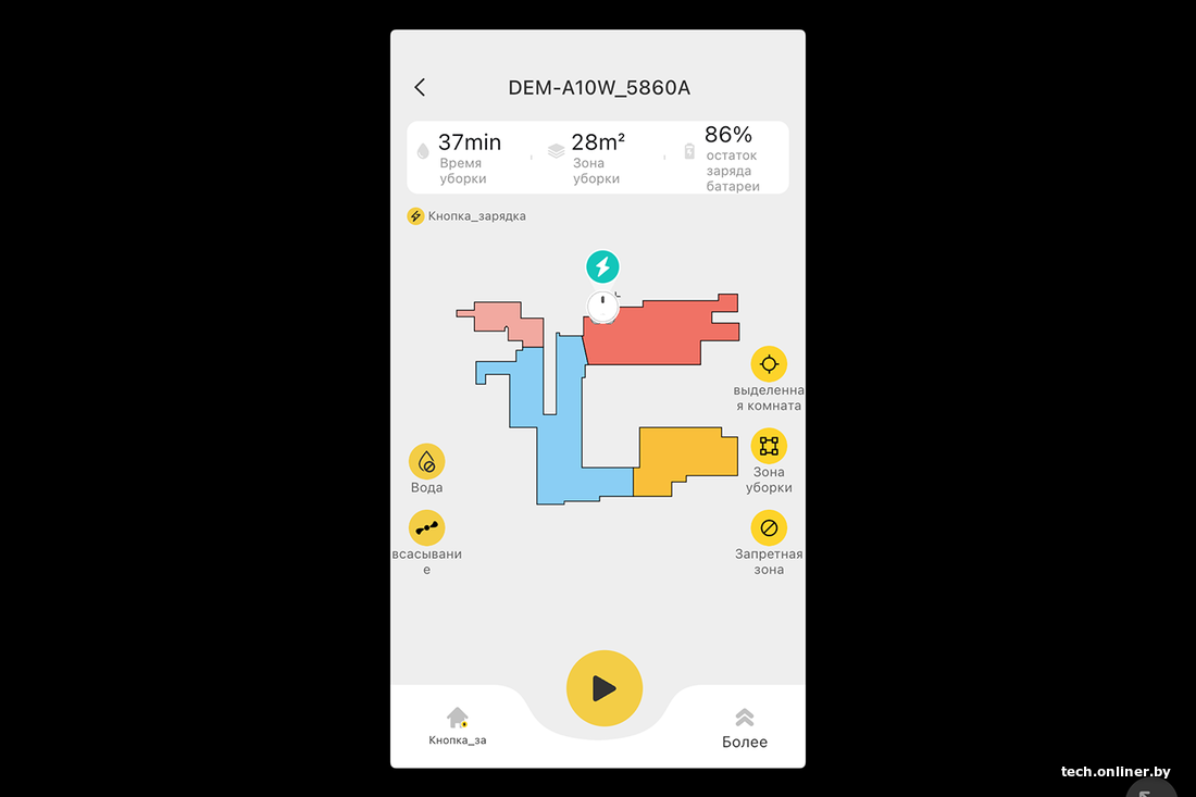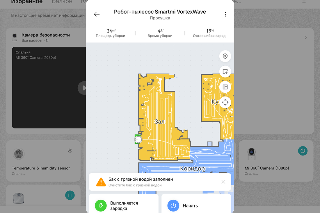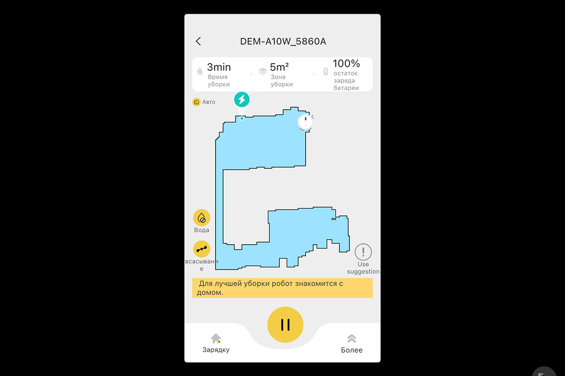 Следующим испытанием была влажная уборка с максимальным уровнем подачи воды. Тут произошло что-то странное. Робот в уже знакомой 60-метровой квартире нашел 81 квадратный метр, проезжая одни и те же участки много раз. За почти два часа уборка так и не была закончена, а пылесос просто разрядился. Долго искал базу, но так и не нашел, остался дремать в другом месте. Да, над навигацией разработчикам стоит еще трудиться.
