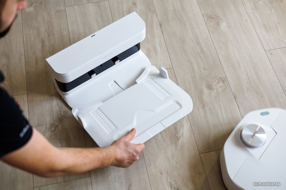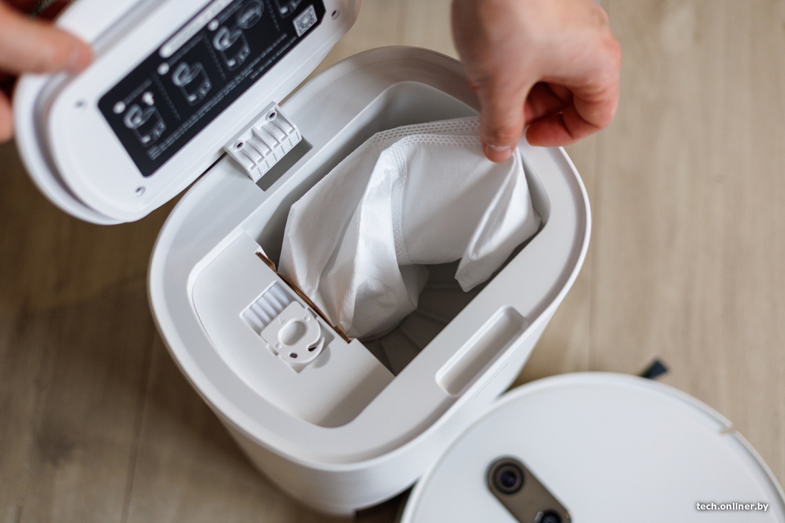 Также пылесос имеет в комплекте станцию самоочистки и пару сменных мешков к ней. После сухой уборки робот приезжает на станцию, которая всасывает мусор в специальный трехлитровый мешок. Это облегчает обслуживание, ведь контейнер не нужно вытряхивать часто. Но поставить робот вместе с базой под тумбу будет затруднительно: станция довольно высокая. Любопытно, что контакты для зарядки могут находиться с разных сторон в зависимости от установленного бака. И пылесос просто подъезжает к станции нужной стороной, после влажной уборки — просто стыкуется с ней без самоочистки.