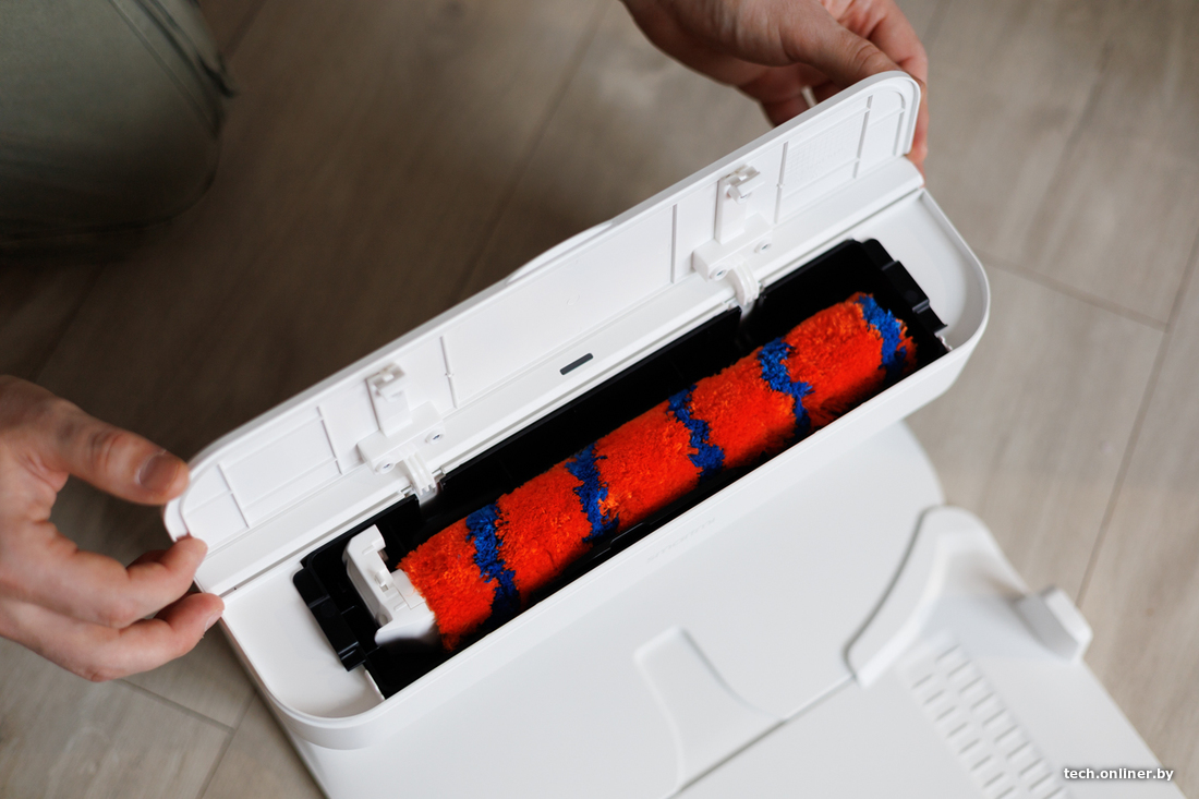 После влажной уборки робот возвращается на базу, где сушит роликовую насадку, а перед началом уборки смачивает ее на специальной подставке.
