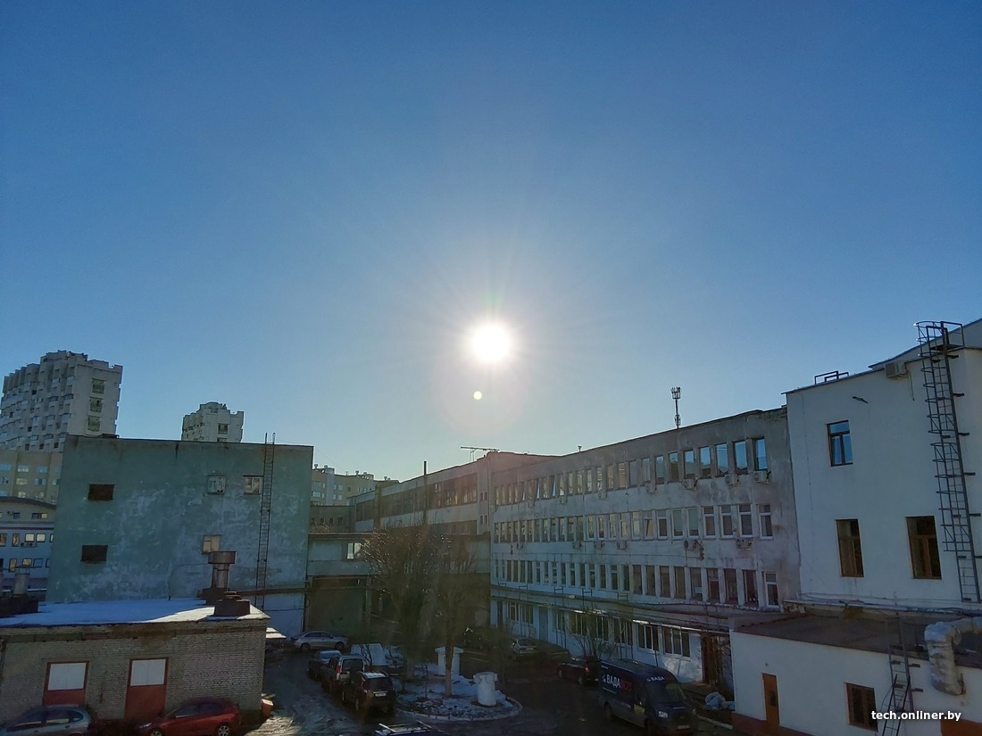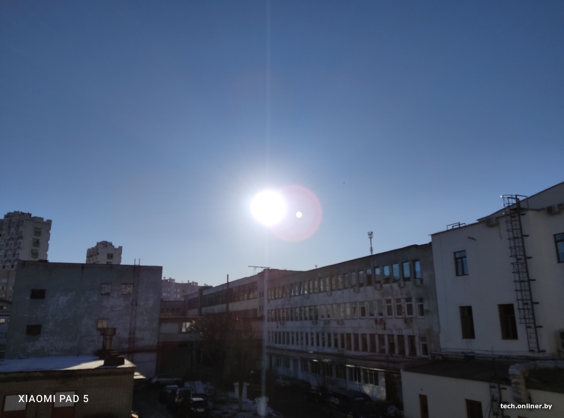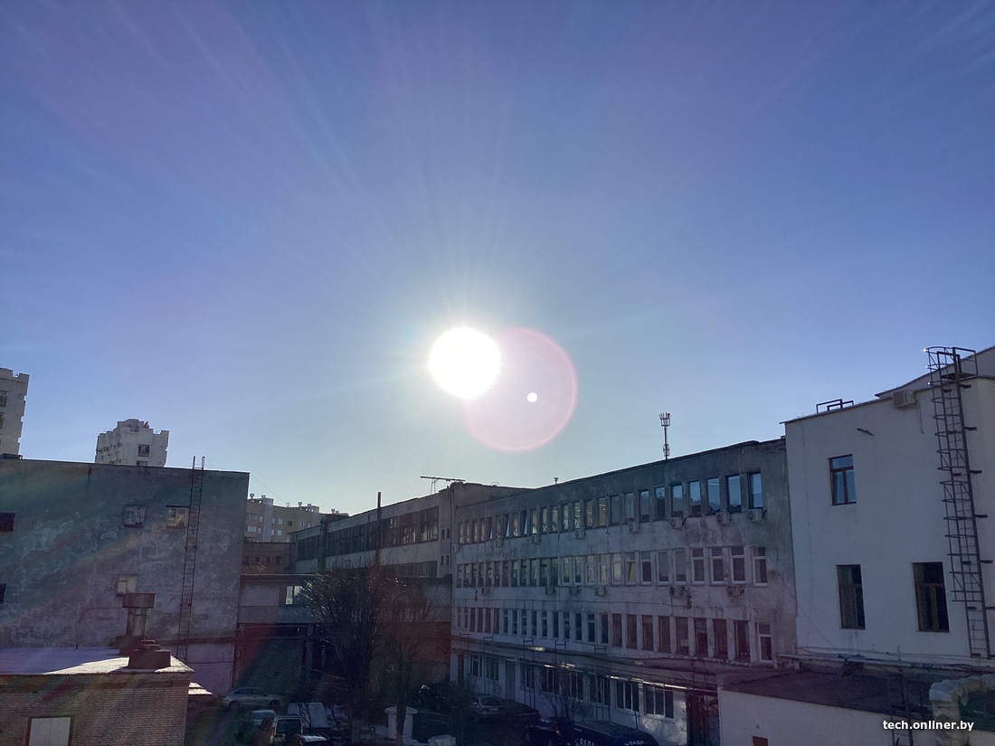 Редкое февральское солнце позволило провести тест со съемкой солнца. При наличии такого мощного и жесткого источника света в кадре мы получаем максимально сложные условия: паразитная засветка между защитным стеклом и линзой, зашкаливающий контраст и очень маленькая точка с аномальной яркостью. Видны сразу все проблемы. Планшеты, как и ожидается, показали себя медленнее смартфонов, приходилось указывать точку фокуса касанием. И только что расхваленный нами Xiaomi при вечерней съемке не смог уверенно сфокусироваться. Лучшая резкость кадра и меньше всего зайчиков — у iPad. Но это скорее потому, что защитное стекло у него круглое и маленькое.
