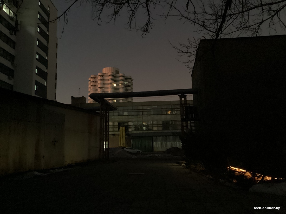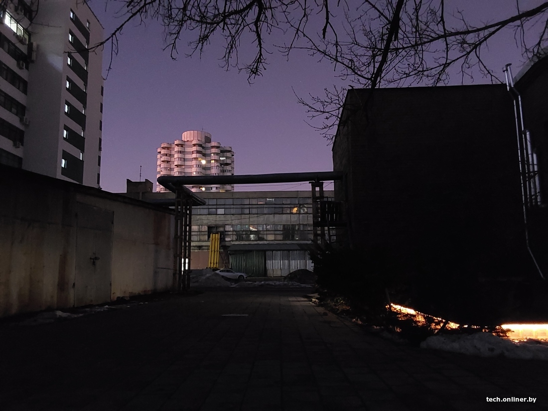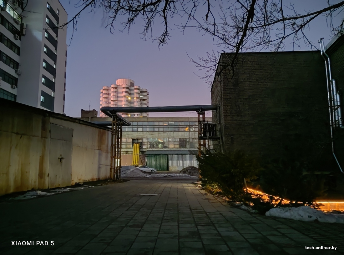 Вечерняя съемка февральского заката. И тут мы видим совершенно разный подход на уровне цвета и экспозиции. Первым вылетает iPad — он скомпенсировал фиолетовый цвет неба какой-то зеленью, деталей практически нет. Samsung идеально попал и в цвет, и в экспозицию — это именно то, что мы видели невооруженным глазом. Xiaomi впечатлил своим пониманием темной сцены — и позволил с рук запечатлеть больше деталей: тут видны и кирпичики на стене, и подсветка снизу, но небо пересвечено.