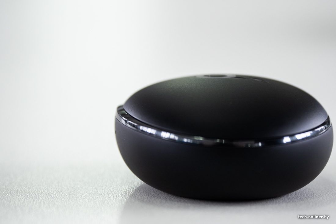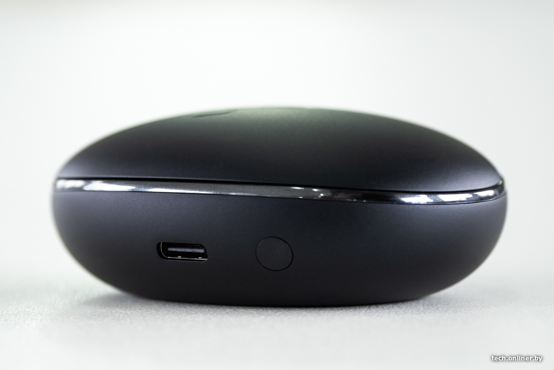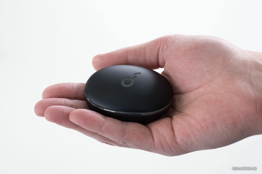 Anker Liberty 3 Pro представлены в четырех цветовых вариантах: лавандовый, белый, серый и черный, в нашем распоряжении — черный. Футляр по форме напоминает ракушку или сплюснутый камень, выполнен из матового пластика с серебристой окантовкой, которая визуально отделяет верхнюю и нижнюю части.