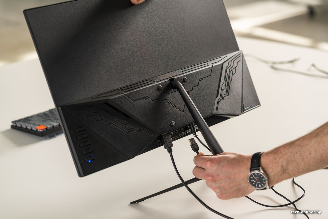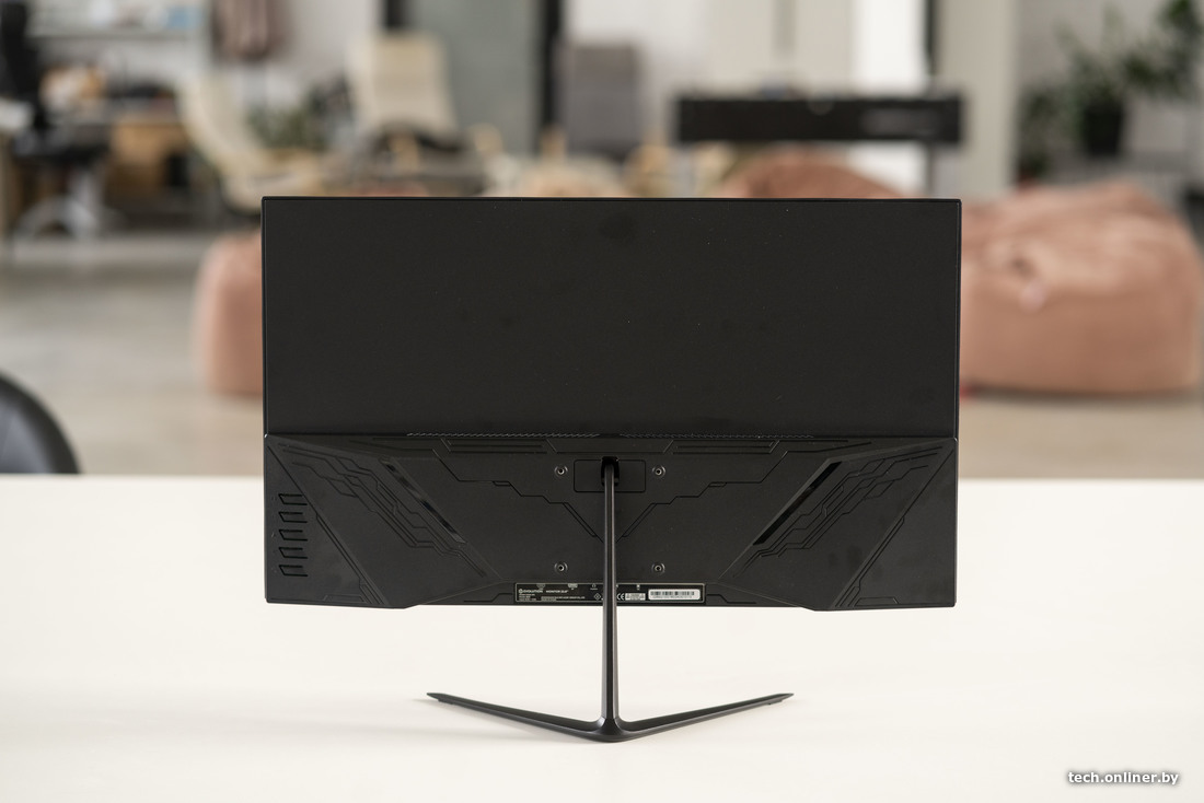 Компактный 24-дюймовый монитор с очень тонкими рамками экрана и узкой подставкой. На ней он шатается, стоит чуть задеть стол. Но в целом выглядит как минимум не стыдно — «худоба» ему к лицу. Задняя сторона стилизована под «игровой» монитор.