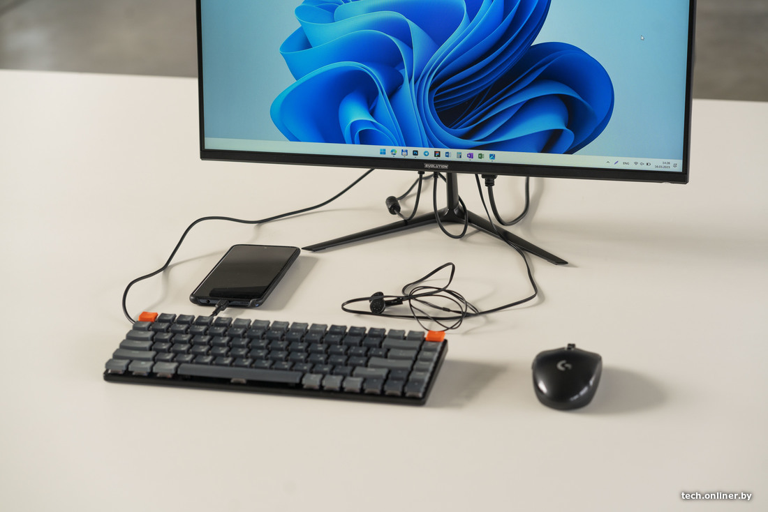 Разводки кабелей нет, а разъемы смотрят вниз. С двумя кабелями все выглядит еще более-менее, но если подключить также наушники и USB-кабель для зарядки смартфона, появляется бардак.